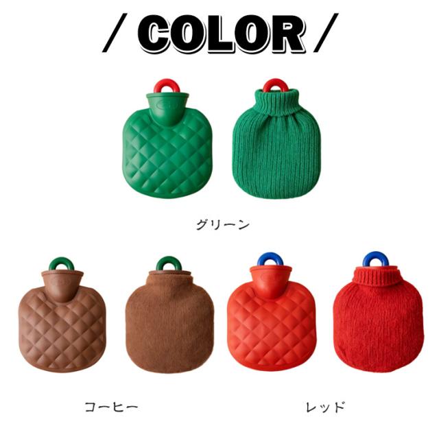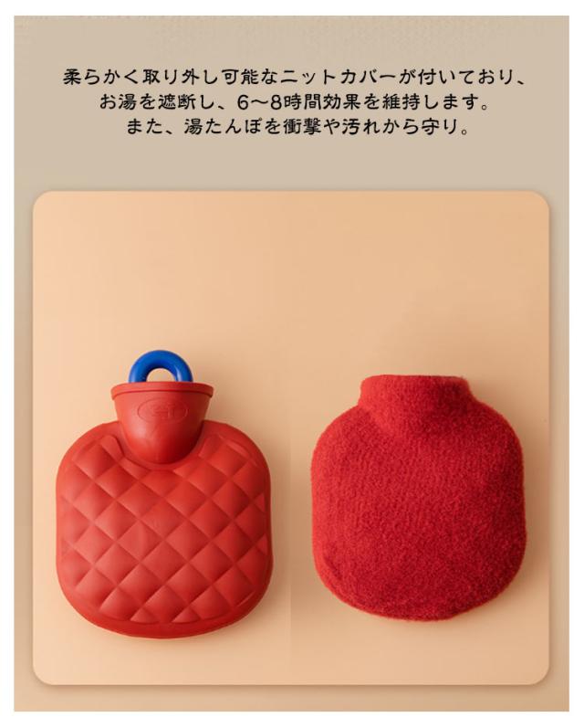 | ニットカバー付きのお湯入れ式ミニ湯たんぽ。 ピンポイントで温めやすい容量350mlの小さめサイズ!(800mlもあり) 持ち運びやすく出先でお湯を入れて使うことも◎ 厳選した高品質のシリコン素材!保温性と耐久性が優れて、匂いなく水漏れの心配もありません! 沸騰したお湯を少し冷ましてから注ぎます(熱湯を使用しないでください)。 水をゆっくりと2/3まで加えます。 閉じ込められた空気をゆっくりと排出し、ネジを締めて漏れがないことを確認してから使用してください。 柔らかく取り外し可能なニットカバーが付いており、お湯を遮断し、6?8時間効果を維持します。 また、湯たんぽを衝撃や汚れから守り。 母の日、感謝祭、クリスマス、元旦に、母親、父親、子供、友人、愛する人への心のこもった贈り物にします。 | |