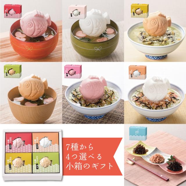みそ汁最中(赤みそ・白みそ)、お吸物最中、お茶漬け最中(海苔・梅・たらこ)、ご飯のおともが入った7種類から4つの組み合わせを選べます。めでたい形の鯛型最中やご飯のおとも3種が入ったカラフルな小箱を4つ並べて詰め合わせたパッケージ。