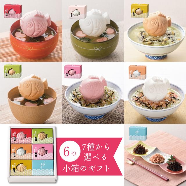みそ汁最中(赤みそ・白みそ)、お吸物最中、お茶漬け最中(海苔・梅・たらこ)、ご飯のおともが入った7種類から6つの組み合わせを選べます。めでたい形の鯛型最中やご飯のおとも3種が入ったカラフルな小箱を6つ並べて詰め合わせたパッケージ。