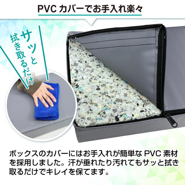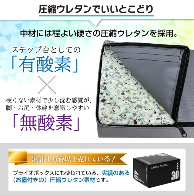 【身体にやさしいから続けられる】累計販売数1万台を超えたプライオボックスにも使われる、程よい硬さの圧縮ウレタンを採用。踏み込むと少し沈むため衝撃を吸収し、膝や足首への負担を抑えやすい設計です。また、少し沈む感覚が脚・お尻・体幹を意識しやすくなり筋力UPも期待できます。