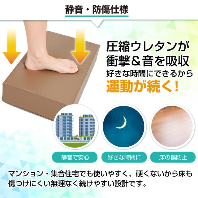 【周りを気にせず、好きな時間に運動できる】圧縮ウレタンが着地時の衝撃と音を吸収、床も傷つけにくい仕様です。マンションや集合住宅でも時間を選ばず使いやすく、生活音を気にせず運動習慣を続けられます。