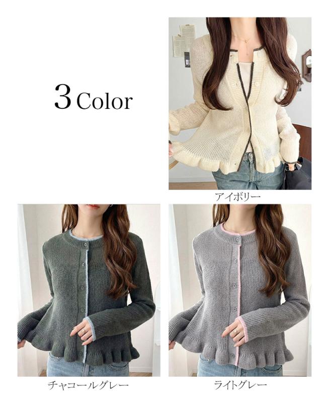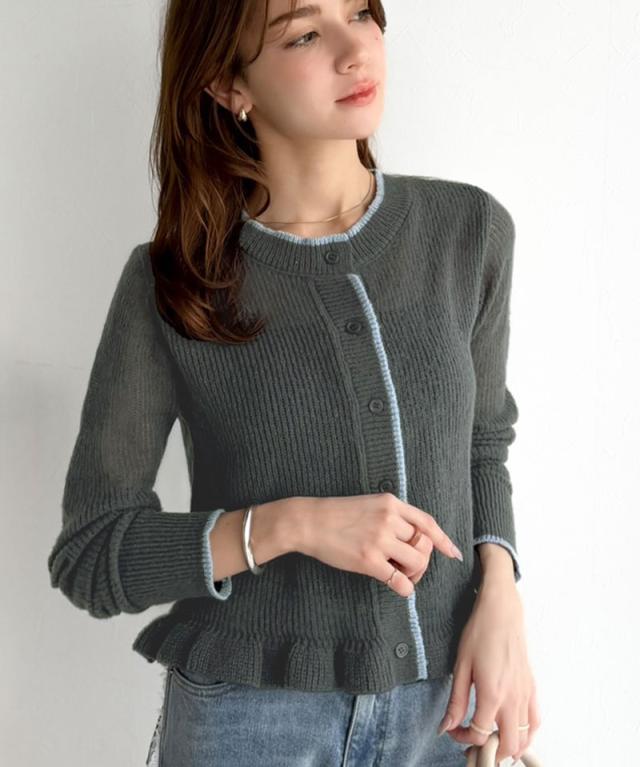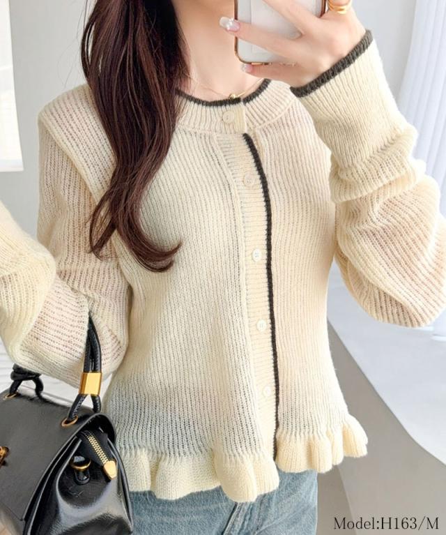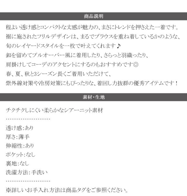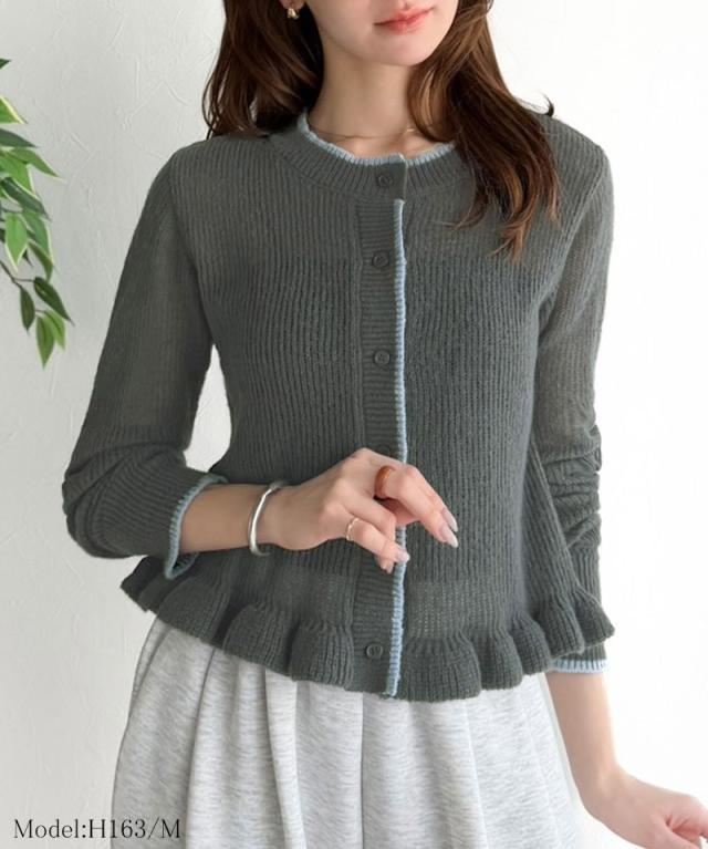 クラシカルエルフ春新作 mily bilet カーディガン レディース トップス ニット レイヤードスタイル 長袖 裾フリル バイカラー 大人可愛い シアー素材 軽やか コンパクト丈 スタイルアップ 着回し力抜群 釦 羽織り 3シーズン 大きいサイズ 2026ss mi1029183
