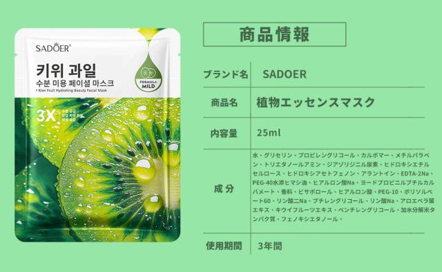 ◎【毎日 パック/美容パック】フルーツエッセンス美容液フェイスマスクです。このマスクはパラベン・鉱物油・エタノール・合成香料・合成着色料・紫外線吸収剤・シリコンを一切使用しておらず、敏感肌の方でも安心してご使用いただけます。やさしい処方で、肌トラブルを抱える方にもおすすめです。日常のスキンケアを簡単にできながら、必要な保湿と美肌ケアもしっかりと叶えます。