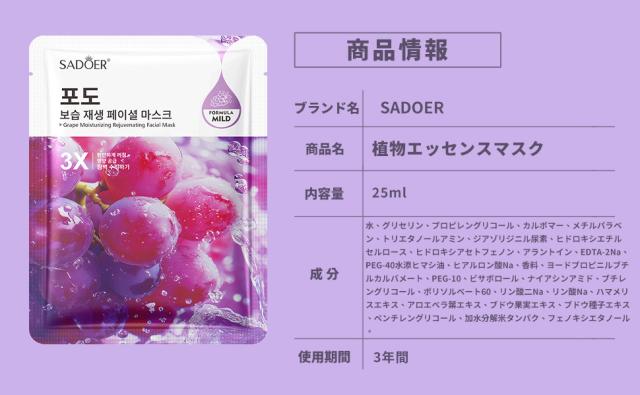 [12枚セット]天然フルーツフェイスマスク 個包装、保湿パック 個包装、【ブドウエキス】シートパック、ビタミン パック、フェイスパック、顔ぱっくマスク 人気、極薄シルク生地、肌にやさしい密着シート、シートマスク 個包装、ナイトパック、朝マスク