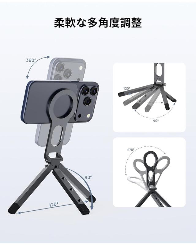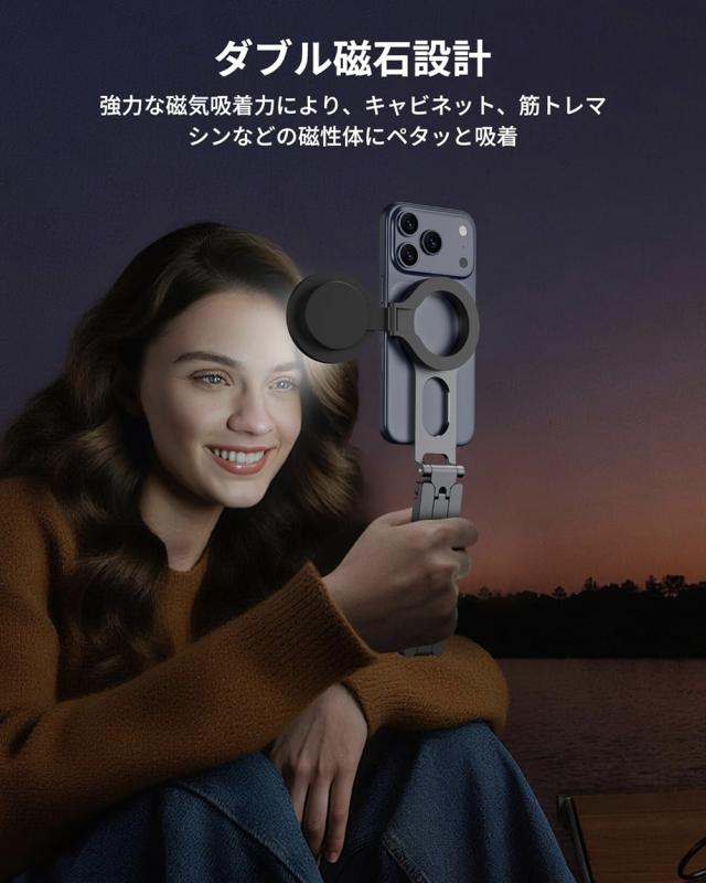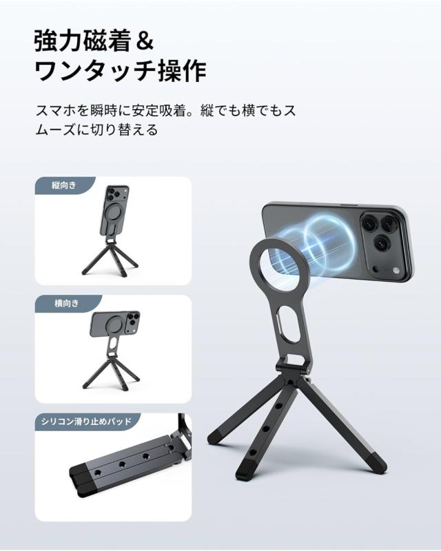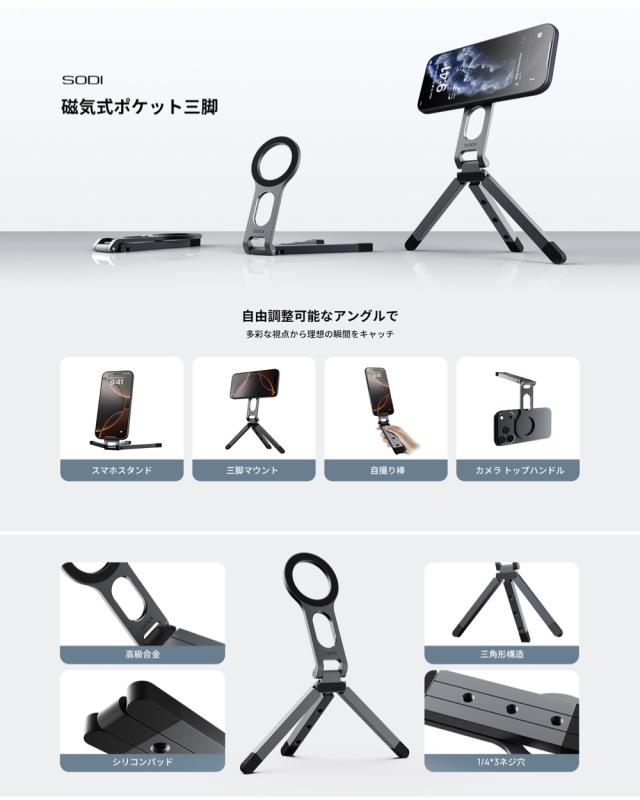| SODI スマホ用三脚 Magsafeに対応 ミニ三脚 Vlogスタンド 両面マグネット式 tripod stand 手持ちスタンド 自撮り棒 角度調整可能 横・縦置き オンライン会議 ライブ 撮影録画 iPhone&Androidに対応可能 メタルリング付き 日本語取扱説明書 | |