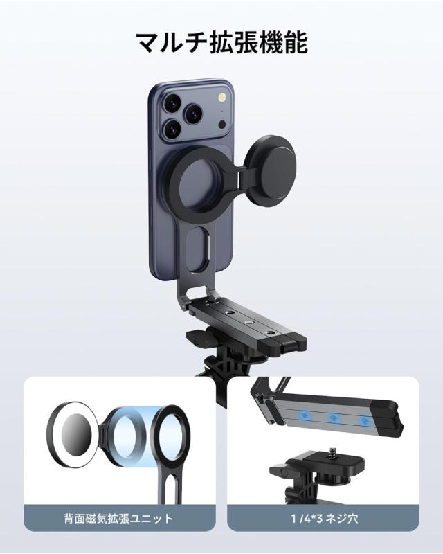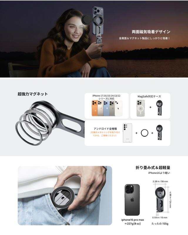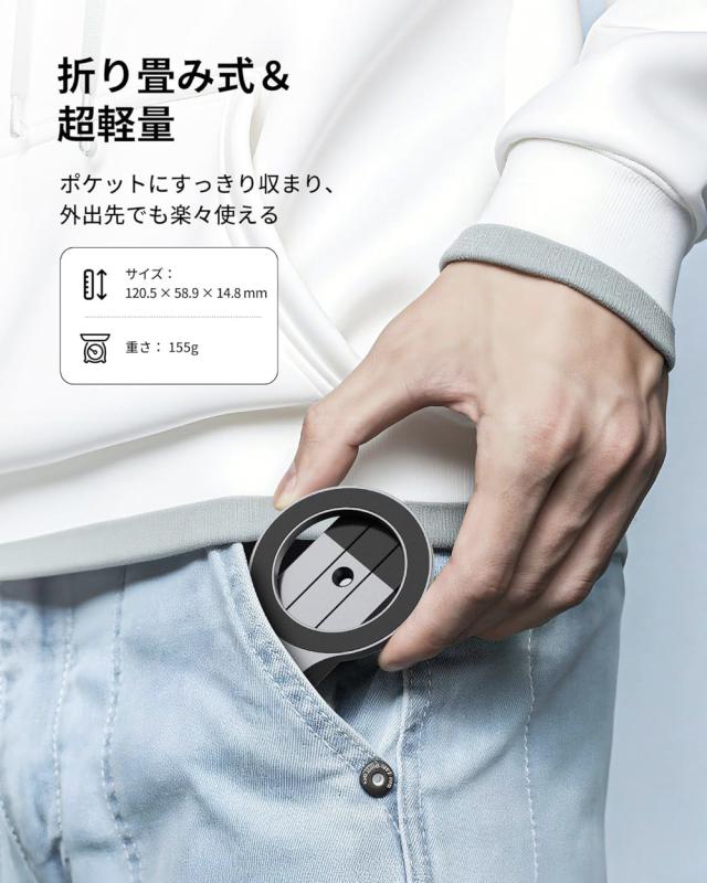 【両面磁石・多種アクセサリー対応】 SODI三脚スタンドは革新的な両面マグネット磁気吸着デザインを採用しており、スタンド機能を実現するだけではなく、磁気拡張プラットフォームとしても大活躍!表面の強力磁石でスマホをしっかり固定し、背面は即座にアクセサリー接続ステーションに早変わり--撮影用ライト、マイクなどのスマホアクセサリーがぴったりと装着。 【折り畳み式&超ポータブル】 真のポケットサイズ撮影パートナー! このマグネット式三脚スタンドは折りたたむとわずか12.4cmで、ほとんどのスマホよりもコンパクト。ポケットや小さなバッグはもちろん、手のひらにすっぽり収まるサイズです。重量はたったの155gなので、通勤や旅行、日常の持ち運びに全く負担になりません——山登りやハイキング、カフェ巡り、急な打ち合わせや自撮りVlogまで、いつでもどこでもすぐに撮影を始められます。 【三角の安定性&雲台対応】 三本の脚部は科学的な力学配置を採用。左右に120度、前後に90度の広い開脚角度を実現し、ローアングル撮影や斜め撮影、デスク上での使用時もしっかり固定されます。底面全体を覆う滑り止めシリコンパッドが、ツルツルな表面やアウトドアの凹凸地形でも安定を保証。中心リングは270度スムーズに回転。より多彩なアングル設定を自由自在にこなします。脚部接続部に内蔵された雲台互換1/4ネジ穴。カメラ三脚や雲台と素早く接続でき、わずか1秒で撮影システムに変貌します。 【多機種の互換性】 iPhone 17、17Pro、17Pro Max、iPhone 16、iPhone 16、16Plus、16Pro、16Pro Max, iPhone 15、15Plus、15Pro、15Pro Max, iPhone 14、 14pro、 14pro max,、14Plus, iPhone 13、13 Pro、 13 Pro Max、13 mini, iphone 12、 12 Pro、12 Pro Max、12 miniやMagSafe搭載ケースに直接装着可能です。Samsung Galaxy、 Sony Xperia 、SHARP AQUOS、FCNT arrows等の磁気(Magsafe)非対応スマホやケースの場合、付属のメタルリングを貼れば簡単に使用することもできます。 |