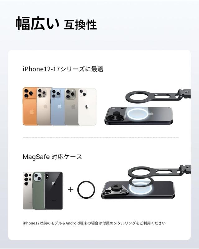 iPhone 17、17Pro、17Pro Max、iPhone 16、iPhone 16、16Plus、16Pro、16Pro Max, iPhone 15、15Plus、15Pro、15Pro Max, iPhone 14、 14pro、 14pro max,、14Plus, iPhone 13、13 Pro、 13 Pro Max、13 mini, iphone 12、 12 Pro、12 Pro Max、12 miniやMagSafe搭載ケースに直接装着可能です。Samsung Galaxy、 Sony Xperia 、SHARP AQUOS、FCNT arrows等の磁気(Magsafe)非対応スマホやケースの場合、付属のメタルリングを貼れば簡単に使用することもできます。