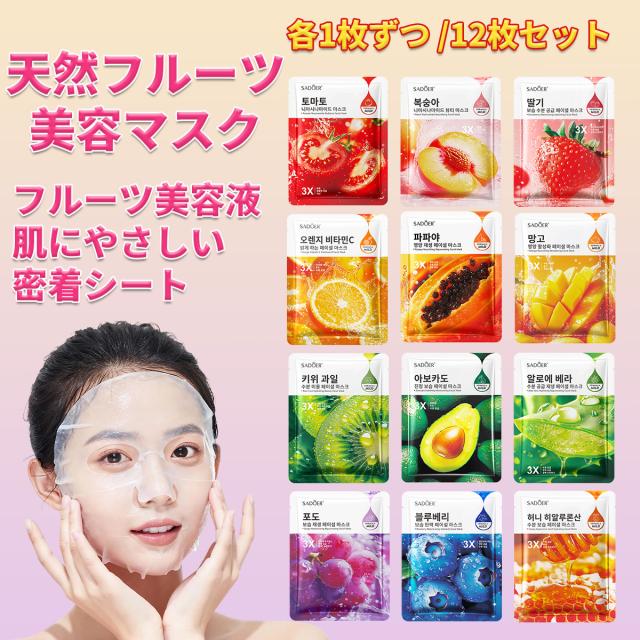 天然フルーツフェイスマスク 個包装、保湿パック 個包装【売れ筋タイプ 12枚セット】シートパック、ビタミン パック、フェイスパック、顔ぱっくマスク 人気、極薄シルク生地、肌にやさしい密着シート、シートマスク 個包装、ナイトパック、朝マスク