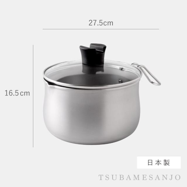 ■サイズ:鍋本体/幅27.5×奥行19×高さ11.5(ガラス蓋含む高さ16.5cm)、鍋内径/18cm×深さ11cm×底厚0.7mm、ガラス蓋/直径19×高さ6cm