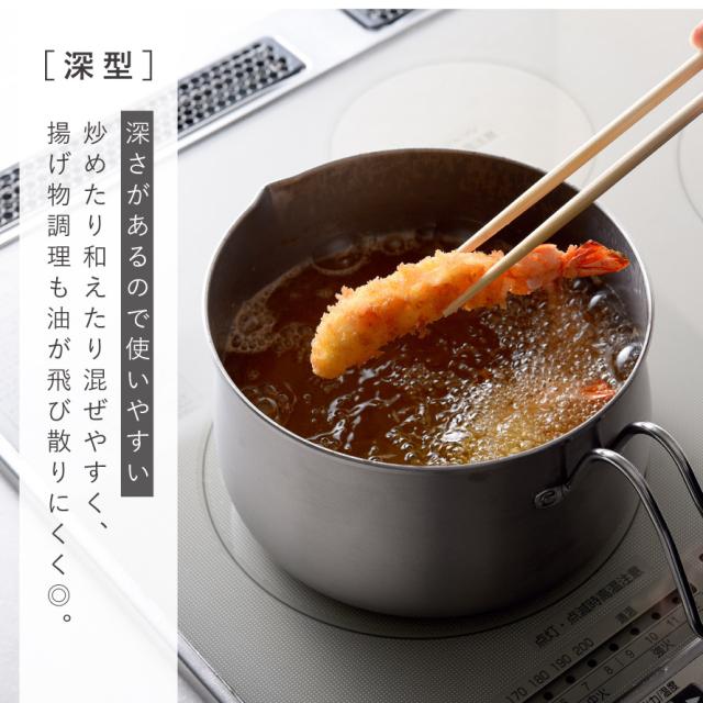 深さがあるので混ぜやすく、炒めたり和えたりも楽チン。揚げ物調理も油が飛び散りにくく回りを汚しにくい形です。レトルトパックも立てて温めることができます。コンパクトで省スペースなのにお米も炊ける優れもの。