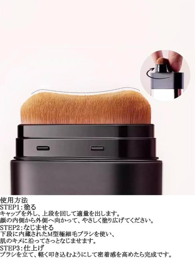 | スティックファンデーション サッとひと塗り! 旬の素肌美メイク 2本セット 1本でナチュラルに仕上がるオールインワンファンデーション ファンデーションとブラシが一体化した便利なオールインワン設計。 これ1本で「塗る・なじませる・仕上げる」が完了し、忙しい朝の時短メイクにも最適です。 付属のM型極細毛ブラシで、ムラなく均一にフィット。 ソフトフォーカス効果により、シワ・毛穴・色ムラなどの肌の凹凸を自然に補正し、なめらかな素肌感を演出します。 目元や小鼻まわりなどの細かな部分にもフィットするM型ブラシ設計。 細部まできれいに仕上がり、厚塗り感のないナチュラルな美肌が完成します。 使用方法 STEP1:塗る キャップを外し、上段を回して適量を出します。 顔の内側から外側へ向かって、やさしく塗り広げてください。 STEP2:なじませる 下段に内蔵されたM型極細毛ブラシを使い、肌のキメに沿ってさっとなじませます。 STEP3:仕上げ ブラシを立て、軽く叩き込むようにして密着感を高めたら完成です。 | |