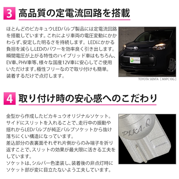 定電流回路を搭載し、車両電圧の上下に影響されることなく安定した点灯を持続します。LEDにかかる負荷を抑え、より長寿命を実現しております。 ハイブリッド車、EV車、PHV車等、さまざまな国産12V車に安心して装着していただけます。
