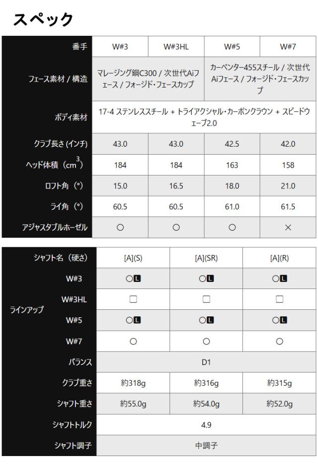 「QUANTUM」フェアウェイウッドは、打ち出し角と打点位置の最適化をテーマに開発がスタート。前作「ELYTE」で採用された、ソール内部に浮かせて配置するスピードウェーブ構造をさらに進化させました。新形状スピードウェーブ2.0のネジ止め位置をヘッド後方に配置することで、フェース下部でのインパクト時でもたわみ量を増大し、ボールスピードのロスを最小限に抑制。高い打ち出しと安定した飛距離性能を実現しています。また、ロフト角とライ角の組み合わせのバリエーションが多い最新のアジャスタブルホーゼル「オプティフィット4」を採用し、ゴルファーひとりひとりの要望に合わせ、弾道を調整することができるようになりました。さらに、以前にも増して抜けが良くなったステップ・ソールデザインも導入。あらゆる方面で完成度が高まりました。「QUANTUM MAX Dフェアウェイウッド」はこれまで以上に簡単に、芝の上からつかまった高弾道を打てるモデルで、W#3、W#3HL、W#5、W#7の4つの番手を用意。ヘッド体積はシリーズの中で最大のモデルになります。AIによるフェース設計も引き続き導入されており、コントロールポイントがさらに強化され、弾道補正効果も大きく高まっています。