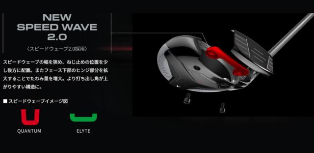 「QUANTUM」のフェアウェイウッドシリーズにおいて着目されたのが、前作のELYTEシリーズからヘッド内部に搭載されているスピードウェーブで、今回、スピードウェーブ2.0へと進化しました。新たにトウ・ヒール方向の幅を狭くし、後方に長く伸ばすことで、その分、ねじ止めの位置を後方に配置。また、前端はフェースの裏面ギリギリまで前進させ、ソール内面から浮かせている高さも、可能な限り低く設計されました。これらによって、フェースカップ下部のヒンジ部分(L字に折れ曲がった部分)の長さを延ばすことが可能となり、フェース下部でのインパクト時でも、たわみ量を増大し、ボールスピードのロスを最小限に抑制。高い打ち出しと安定した飛距離性能を実現しています。また、浅重心設計により、インパクトでヘッドコントロールしやすくなっています。