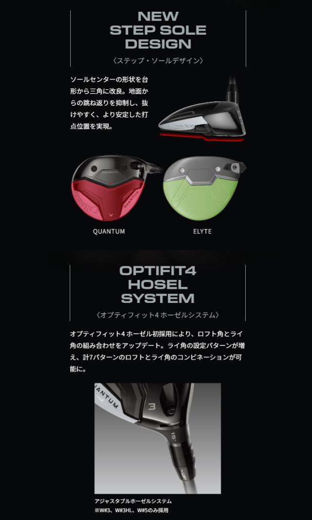 「QUANTUM」のフェアウェイウッドシリーズにおける前作からの大きな変化は、ホーゼル部分にもあります。今回から、ELYTEのユーティリティで初採用となったオプティフィット4と呼ばれるアジャスタブルホーゼルが搭載されました。従来のアジャスタブルホーゼルよりも、ロフト角とライ角の設定バリエーションが増えているもので、各々のゴルファーごとに好みの弾道を得られやすくするだけでなく、番手間の飛距離のギャップを、より適正なものに調整できるようにもなりました。(※従来のアジャスタブルホーゼル付きシャフトは互換性が無く、使用できません)