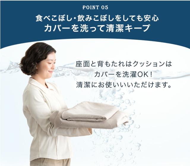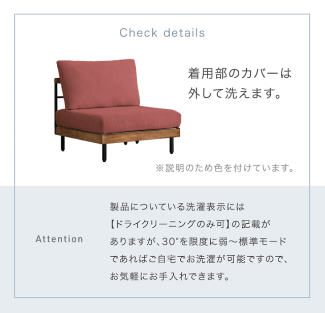 ※本ソファのカバーはご家庭でお洗濯可能です。製品についている洗濯表示には「ドライクリーニングのみ可」の記載がありますが、30℃を限度に弱〜標準モードであればご自宅の洗濯機でお手入れできます。