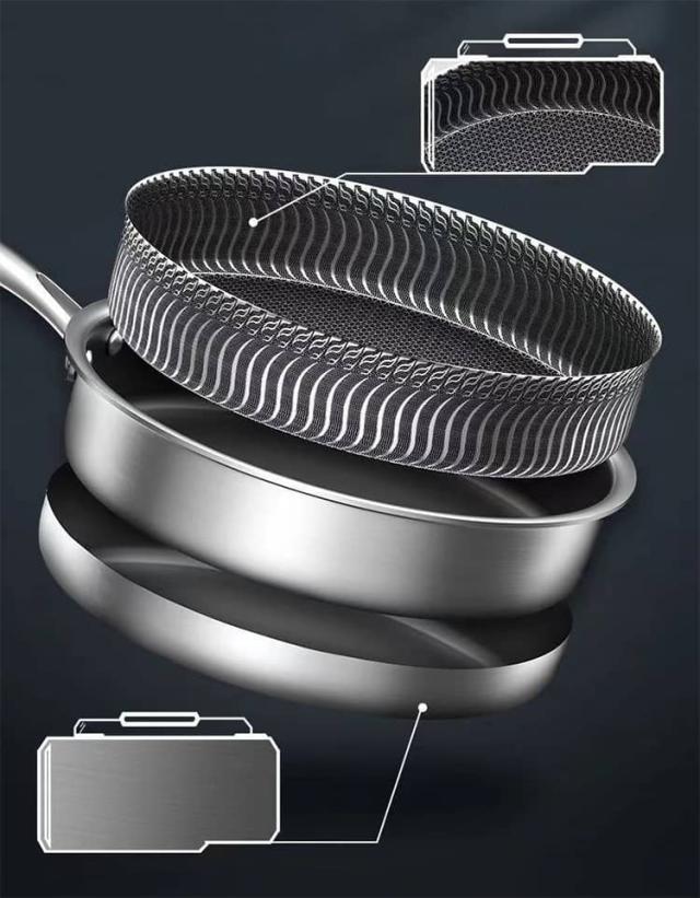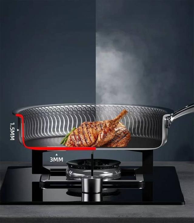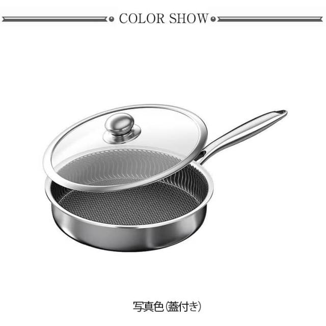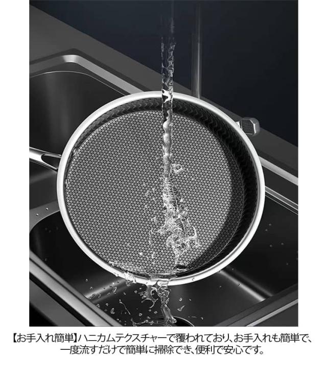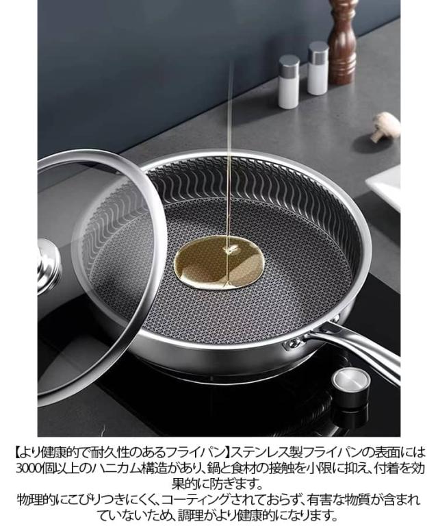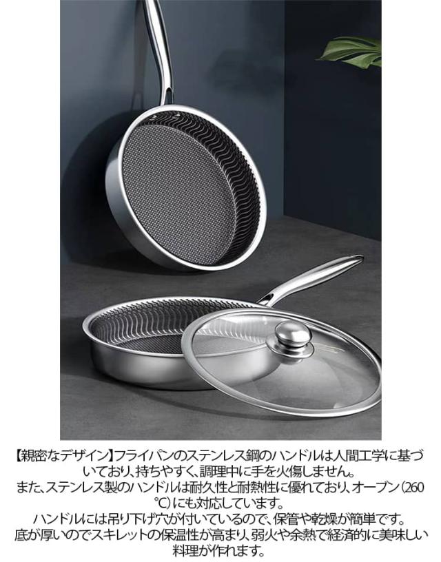 | 【より健康的で耐久性のあるフライパン】ステンレス製フライパンの表面には3000個以上のハニカム構造があり、鍋と食材の接触を小限に抑え、付着を効果的に防ぎます。 物理的にこびりつきにくく、コーティングされておらず、有害な物質が含まれていないため、調理がより健康的になります。 【親密なデザイン】フライパンのステンレス鋼のハンドルは人間工学に基づいており、持ちやすく、調理中に手を火傷しません。 また、ステンレス製のハンドルは耐久性と耐熱性に優れており、オーブン(260℃)にも対応しています。ハンドルには吊り下げ穴が付いているので、保管や乾燥が簡単です。底が厚いのでスキレットの保温性が高まり、弱火や余熱で経済的に美味しい料理が作れます。 【あらゆる熱源に対応】鍋は5層複合構造のステンレス製で、傷がつきにくく、摩耗に強いです。 底面は反りの少ないスチール製で、ガスコンロなどオール熱源に対応し、様々な調理ニーズに対応します。 【お手入れ簡単】ハニカムテクスチャーで覆われており、お手入れも簡単で、一度流すだけで簡単に掃除でき、便利で安心です。 | |