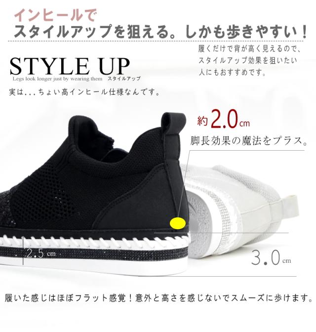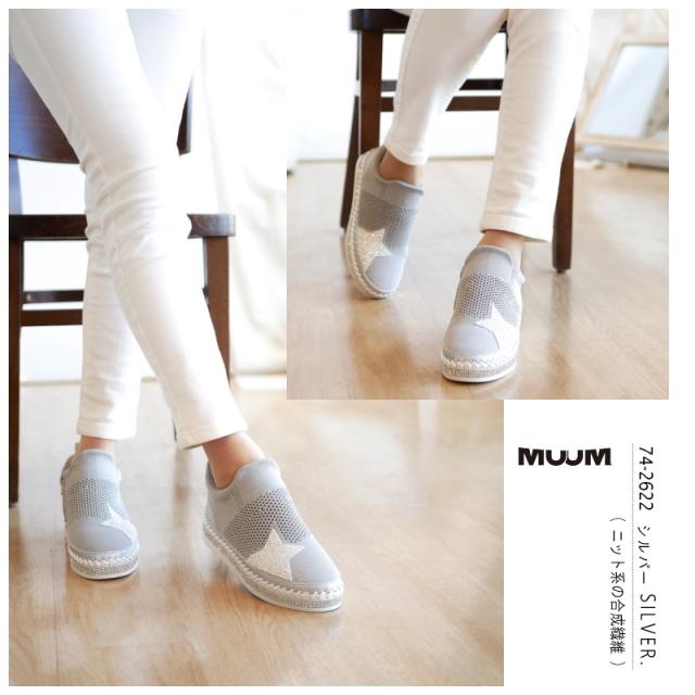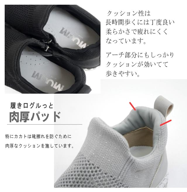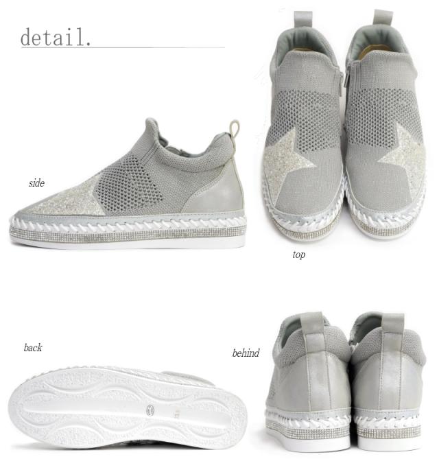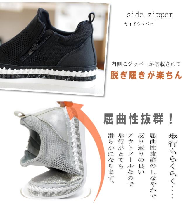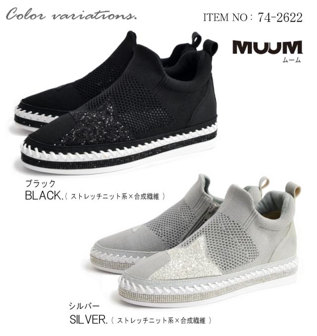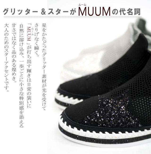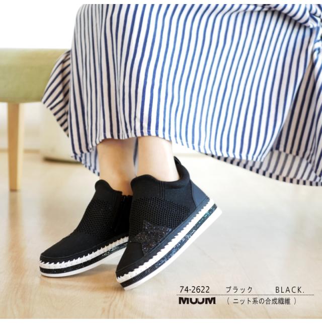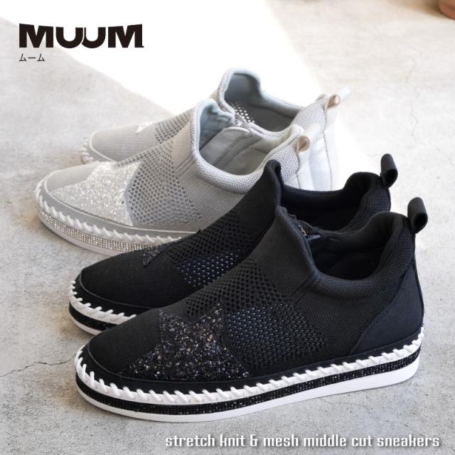 スニーカー レディース 幅広 3E ミドルカット ストレッチニット メッシュ MUUM ムーム グリッター 星 キラキラ ラインストーン インヒール フラット 脚長効果 ファスナー ラウンドトゥ