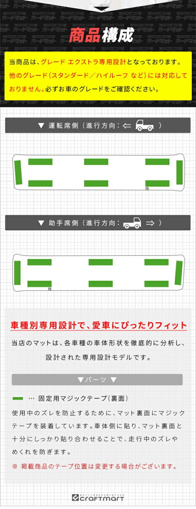 | 商品構成 | ・ドアポケット(運転席側)用ガードマット 1枚 ・ドアポケット(助手席側)用ガードマット 1枚 ※ 当商品は、グレード エクストラ専用設計となっております。他のグレード(スタンダード/ハイルーフ など)には対応しておりません。必ずお車のグレードをご確認ください。 |