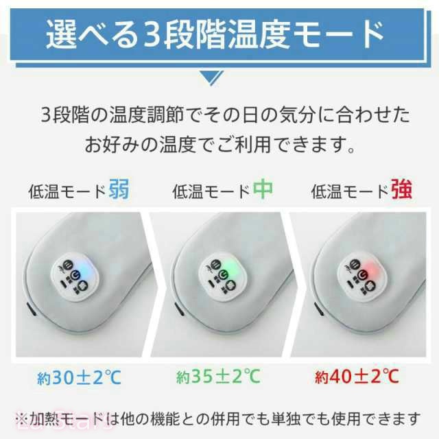 【快適温度と振動ケア】高(約40℃)、中(約35℃)、低(約30℃)の3つの暖房モードと、5段階の振動モードを搭載し、お好みに合わせて自由に選ぶことができます。 遮光性の高いアイマスク 就寝中の使用に適しているす。発熱機能をオフして、冷却ジェル×振動での使用もできます。遮光性に優れている アイマスク 睡眠用にも適しています。