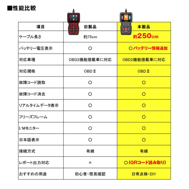 約250cmの超ロングケーブルを装備。車両のOBD2コネクタに接続して車両の各種情報を確認しやすくなりました。約36000件の故障コード情報内蔵。9つのOBD?U/EOBD標準プロコトルに対応。