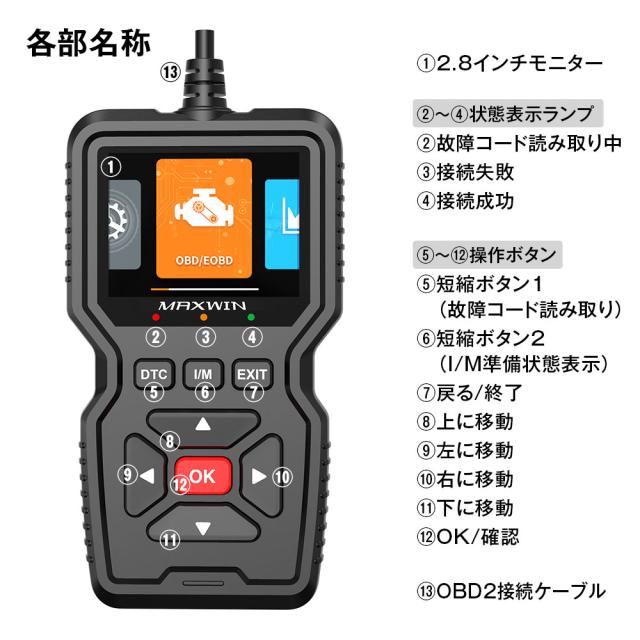 OBD2 診断機 車両 故障診断 OBD スキャナー 故障コード 約36000件内蔵 ロングケーブル 日本語対応 自動車 スキャンツール エンジン 警告灯 チェックランプ 故障コード 読み取り