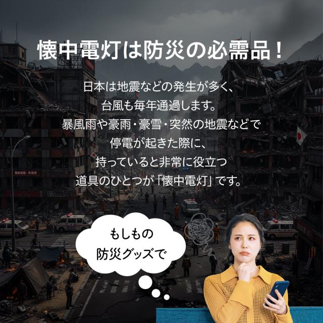 電池式と充電式の兼用タイプで、普段使いはもちろん、非常時にも安心して使用できます。