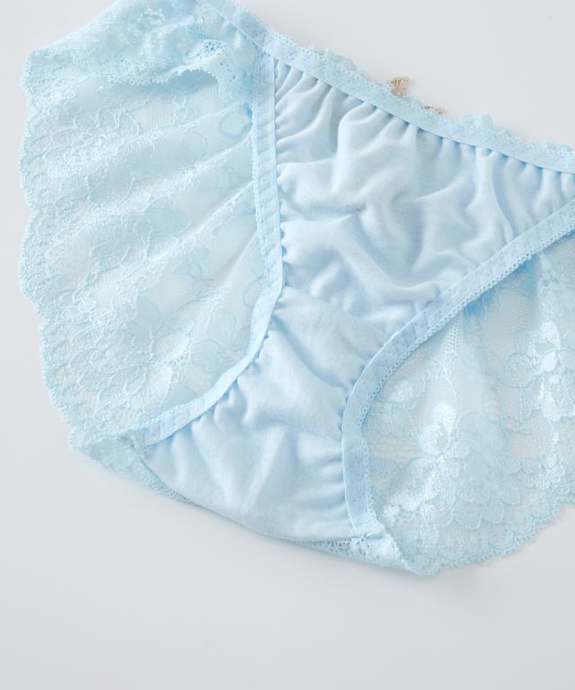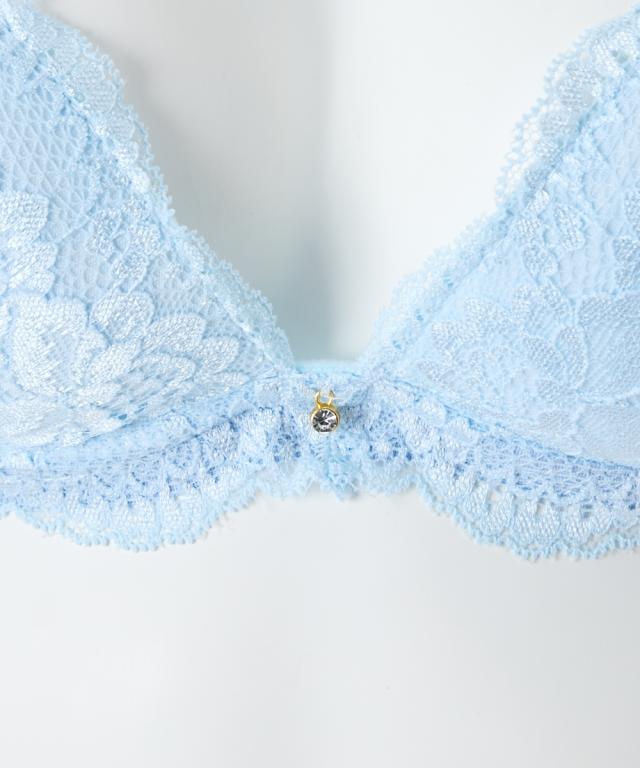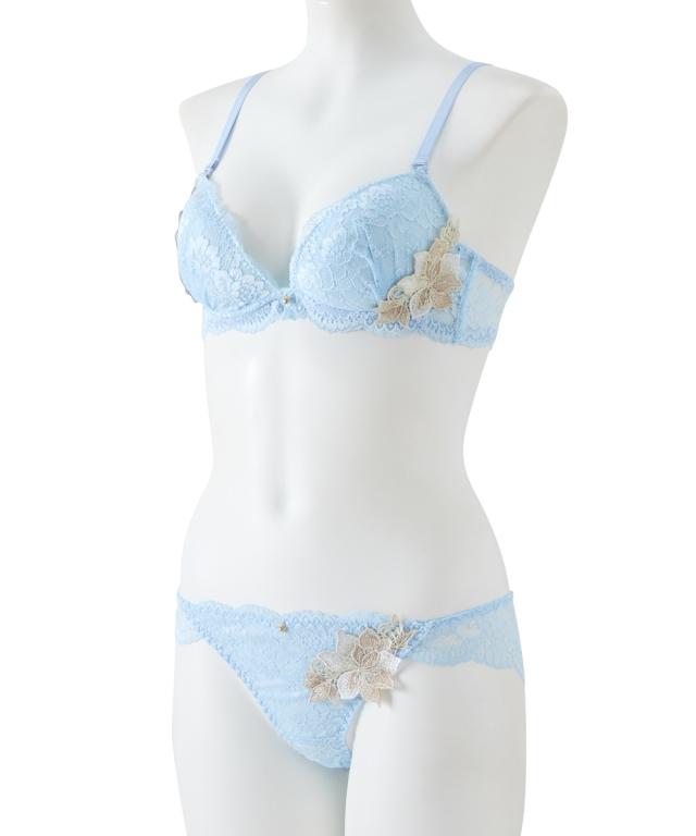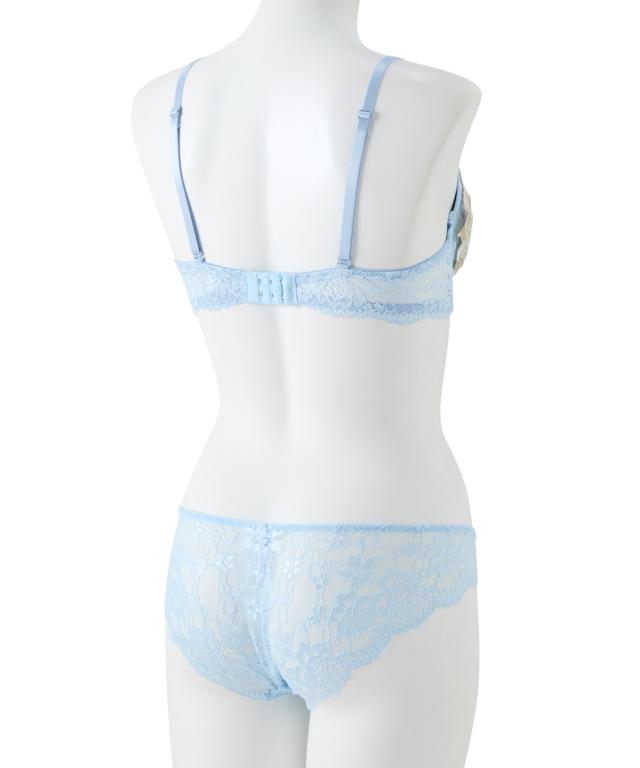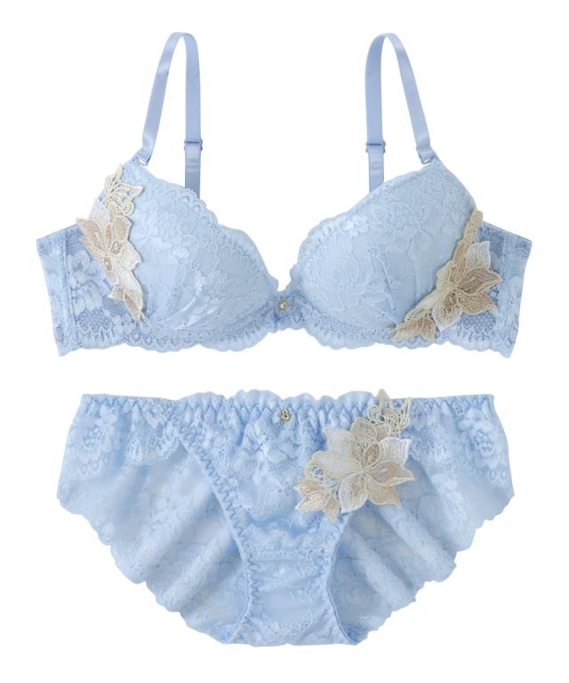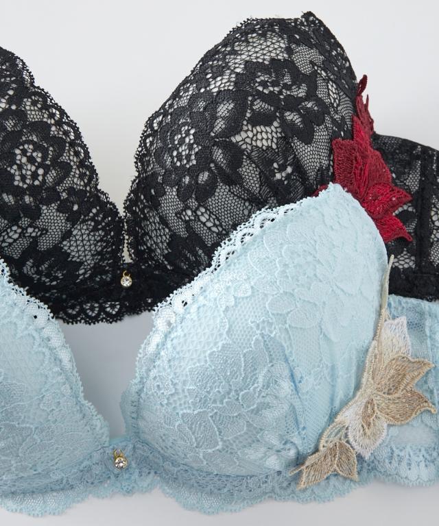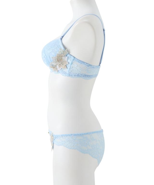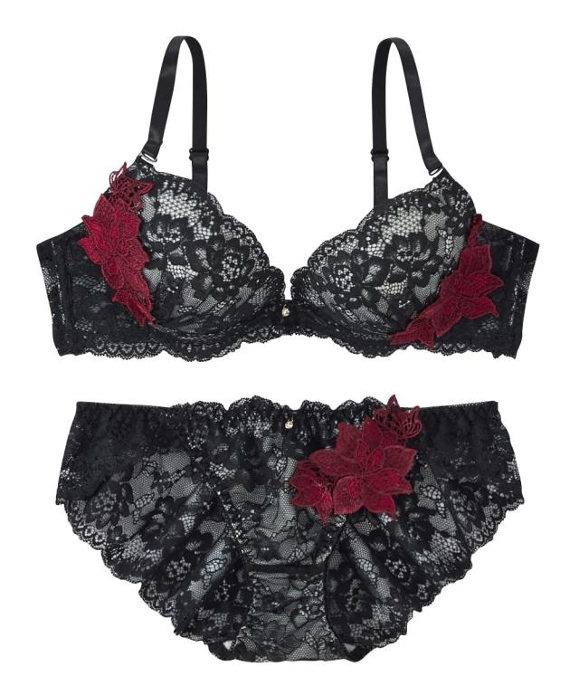 ゴージャスで繊細なレースに存在感ある大輪の花のレースアップリケとの対比が優美な美しさを演出 可憐に盛る厚盛りパッド付き 胸元とショーツにきらりと光るチャーム付き ショーツは総レースでやわらかで繊細なレースをたっぷり使用