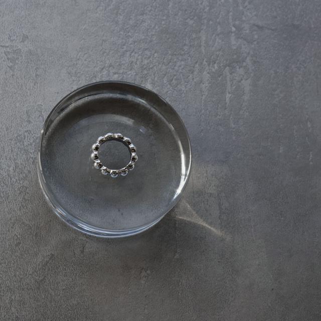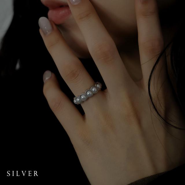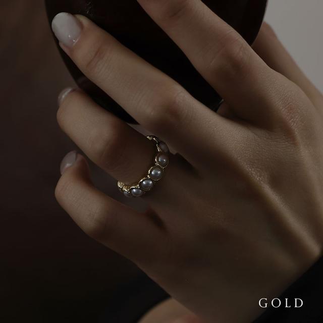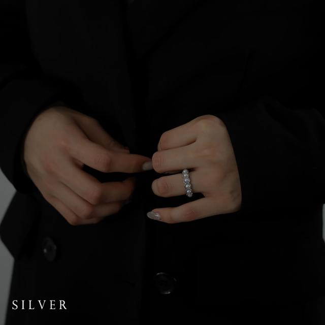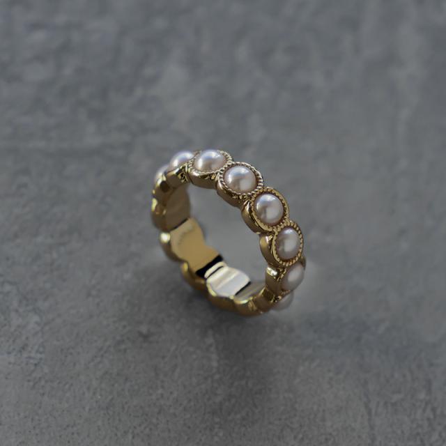 小粒のパールをセットした円形の台座を連ねたリングです。