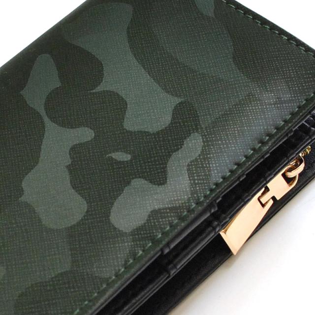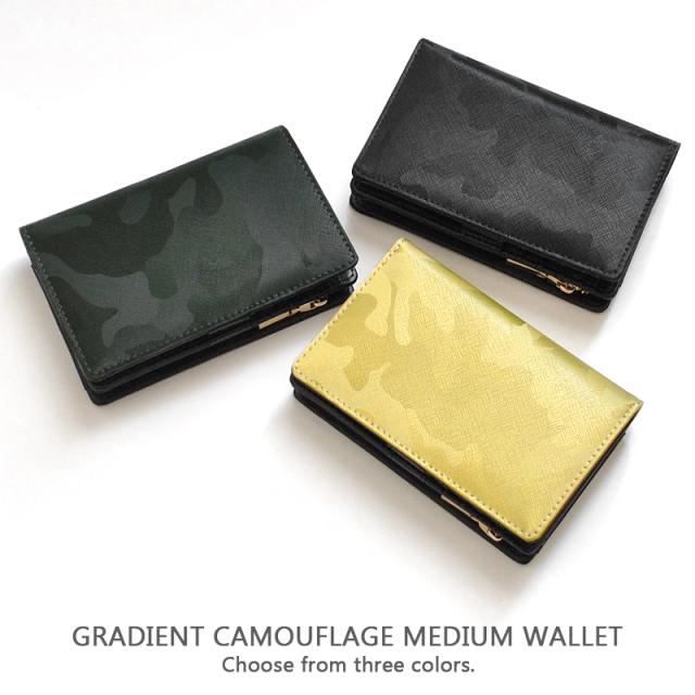 商品カテゴリ:財布 さいふ 折財布 二つ折り財布 ミドル ミドル財布 革財布 2つ折り 革 レザー 多機能 多収納 迷彩 カモ柄 ギフト プレゼント 贈り物 金色 緑 黒 派手 かっこいい