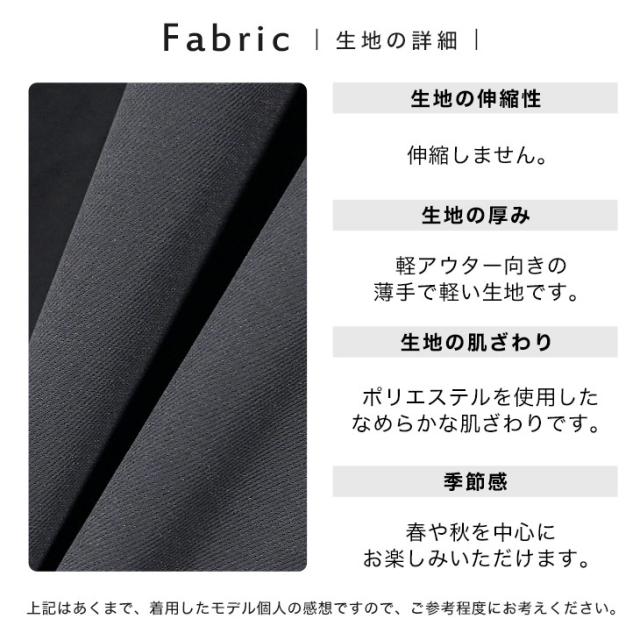 ポリエステルを使用し、ならかなとろみ感を演出する生地は、優雅さを感じる落ち感で上品な雰囲気に。また程よい厚みと重さがあるので上質な印象を与えてくれるライトアウターです。