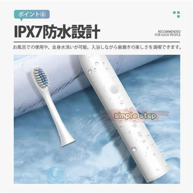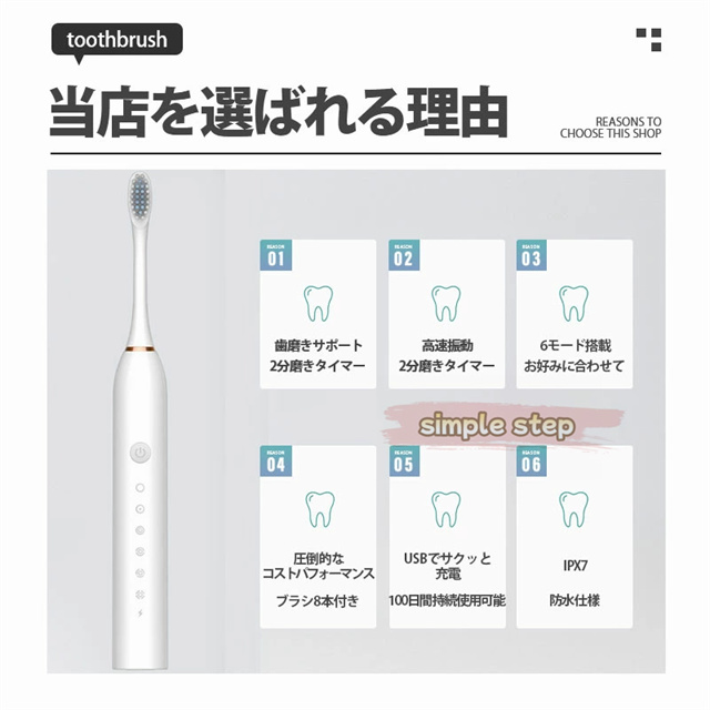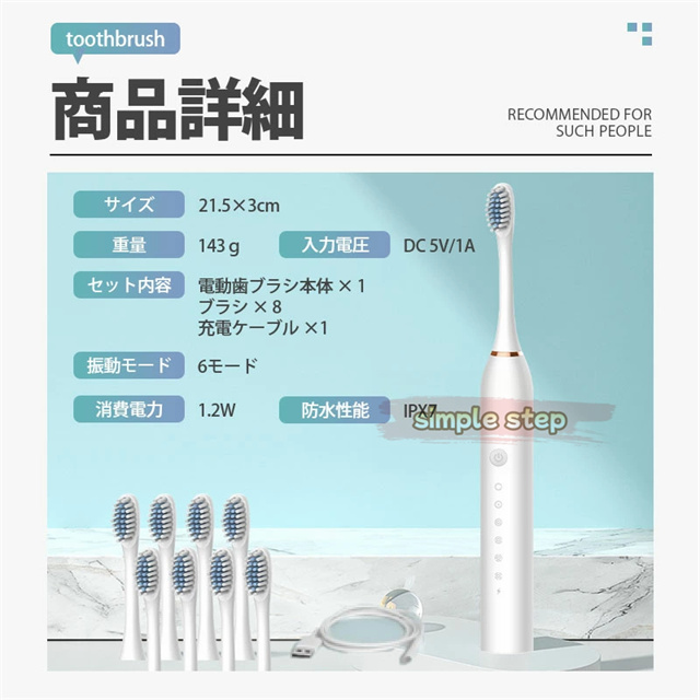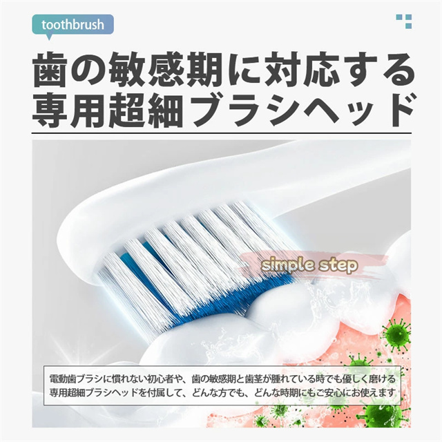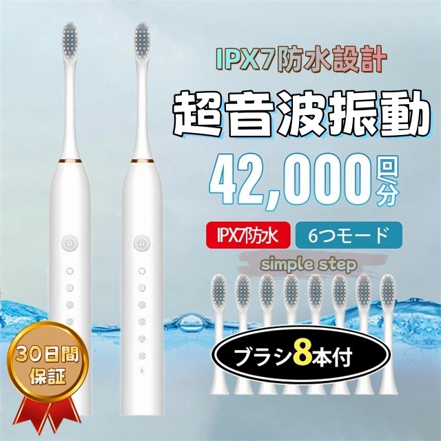 【ブラシ8本付き!】電動歯ブラシ 替えブラシ 替えブラシ8本付き 音波歯ブラシ 充電式 本体 超音波 歯ブラシ IPX7 防水設計 歯磨き 静音 強力 おしゃれ 携帯 子供 大人