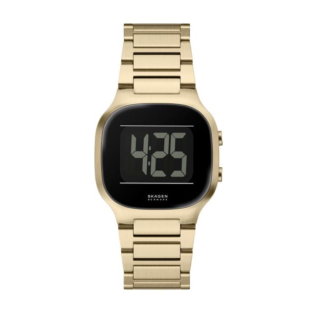 このデジタルウォッチは、モダンな機能と大胆なデザインを融合させ、洗練されたクッション型のケースと洗練されたゴールドトーン仕上げが特徴です。