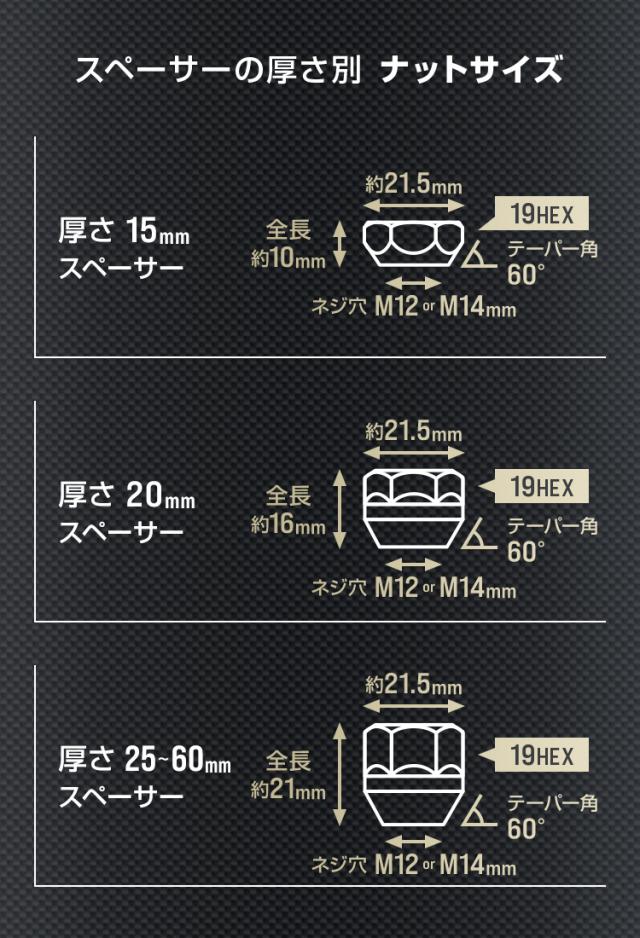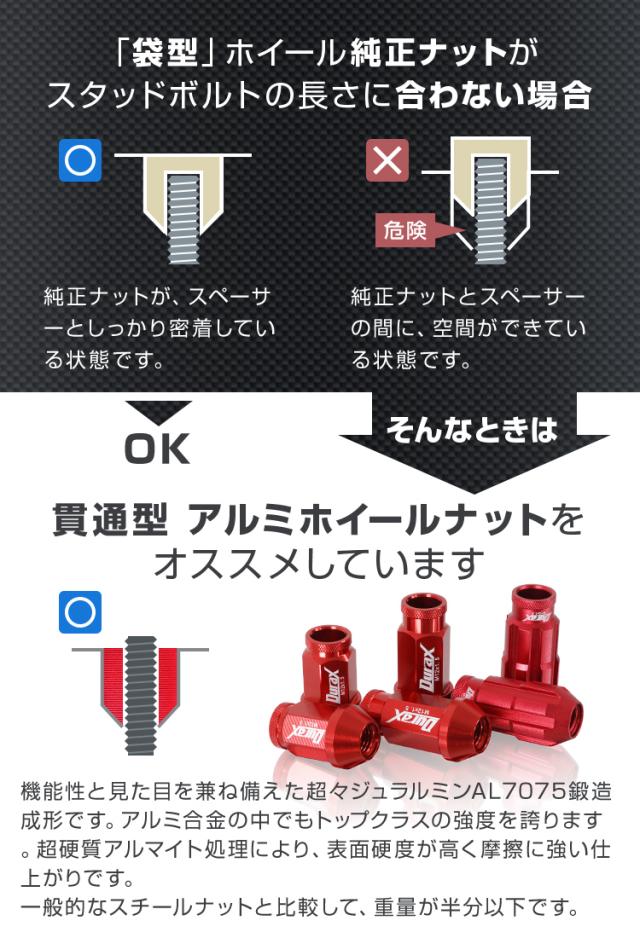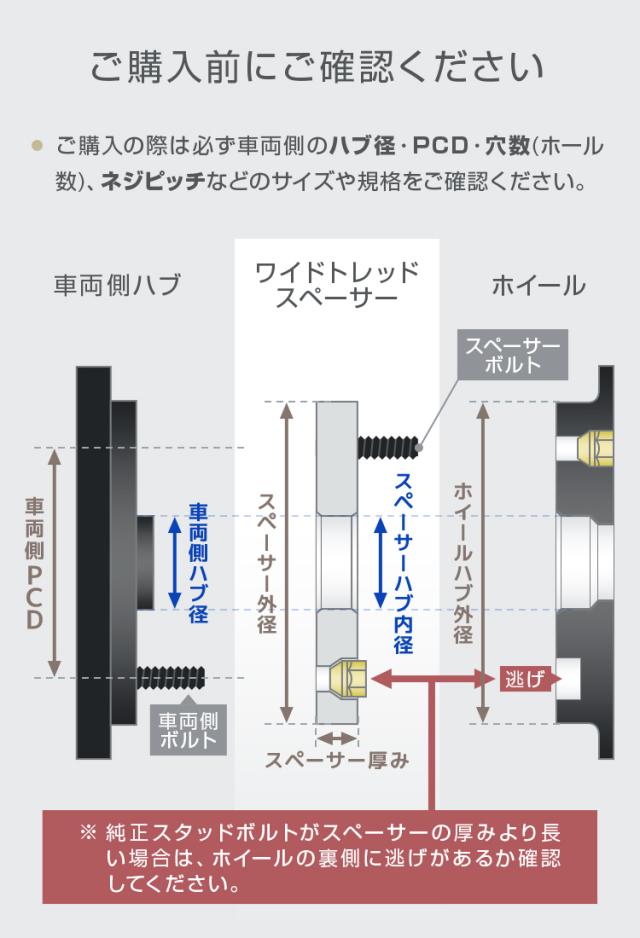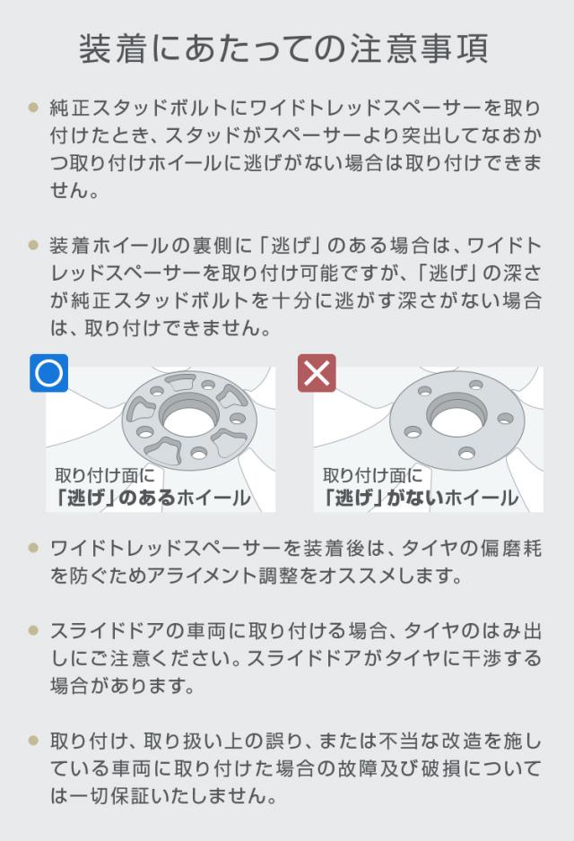 | 注意事項 | ・純正スタッドボルトにワイドトレッドスペーサーを取り付けたとき、スタッドがスペーサーより突出してなおかつ取り付けホイールに逃げがない場合は取り付けできません。 ・装着ホイールの裏側に「逃げ」のある場合は、ワイドトレッドスペーサーを取り付け可能ですが、「逃げ」の深さが純正スタッドボルトを十分に逃がす深さがない場合は、取り付けできません。 ・ワイドトレッドスペーサーを装着後は、タイヤの偏摩耗を防ぐためアライメント調整をオススメします。 ・スライドドアの車両に取り付ける場合、タイヤのはみ出しにご注意ください。スライドドアがタイヤに干渉する場合があります。 ・取り付け、取り扱い上の誤り、または不当な改造を施している車両に取り付けた場合の故障及び破損については一切保証いたしません。 |