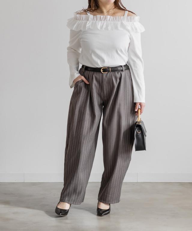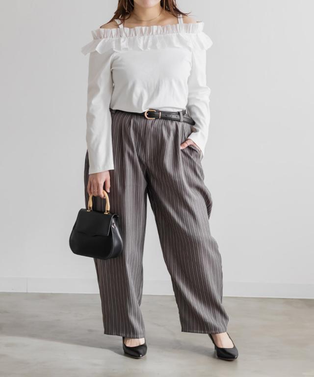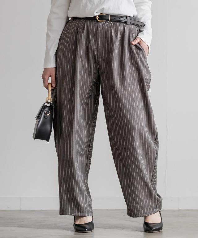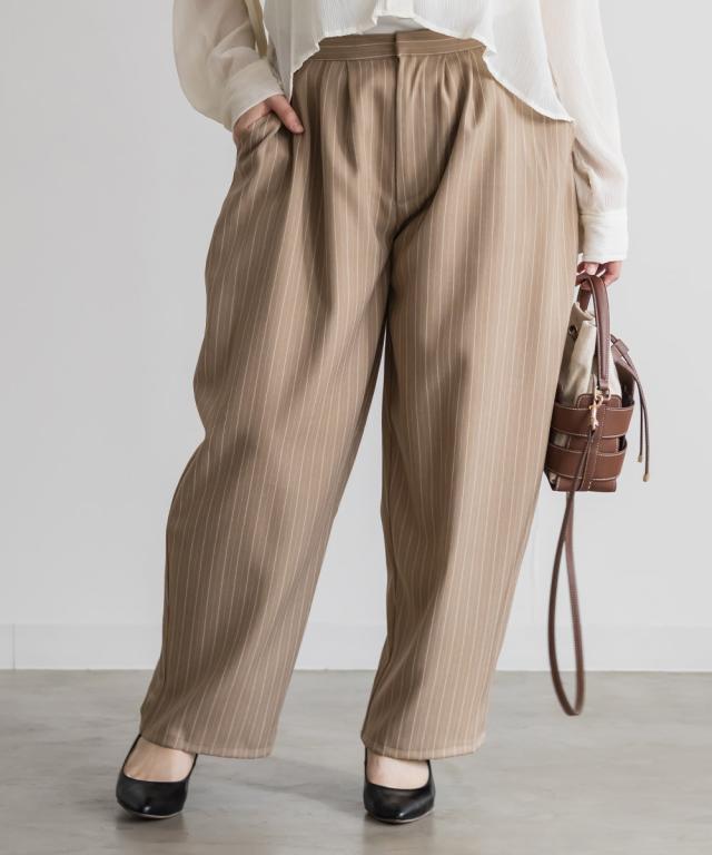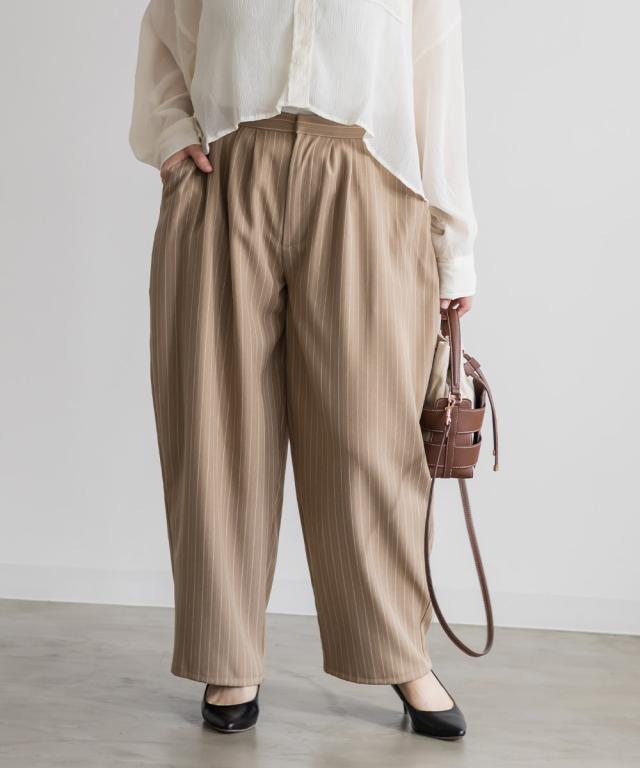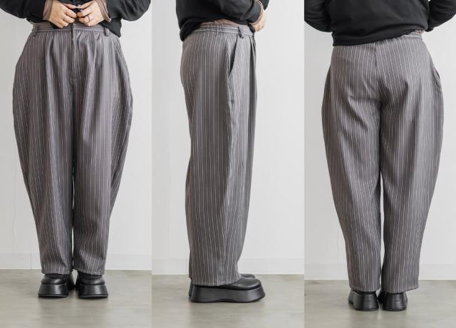 | 3Lサイズを着用しました。ウエストはちょうどいい着用感で、ツータック入りなのでお腹まわりに余裕があり、長時間穿いても楽でした。バレルシルエットが太ももからヒップラインを自然にカバーしてくれて、ストライプ柄の縦ライン効果ですっきり見えするのが嬉しいです。 ハリ感のある素材でラインを拾いにくく、きれいめにもカジュアルにも合わせやすい印象。シンプルなトップスと合わせるだけでコーデが決まるので、デイリー使いしやすいパンツだと思いました◎ |