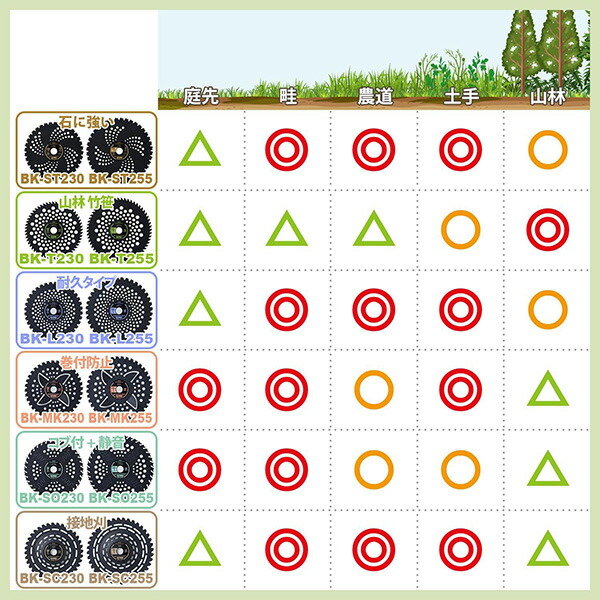 | 商品説明 | ●刈り払機用チップソー ●4枚のボディナイフで巻付、絡みを防止 ●チップのラウンド形状と台金刃で刈感アップ ●一般雑草下刈り用 【BK-MK230】 ・取付穴径:25.4mm ・刃数:36 ・外径:230mm ・おすすめ排気量:25cc以下 【BK-MK255】 ・取付穴径:25.4mm ・刃数:40 ・外径:255mm ・おすすめ排気量:25cc以上 |