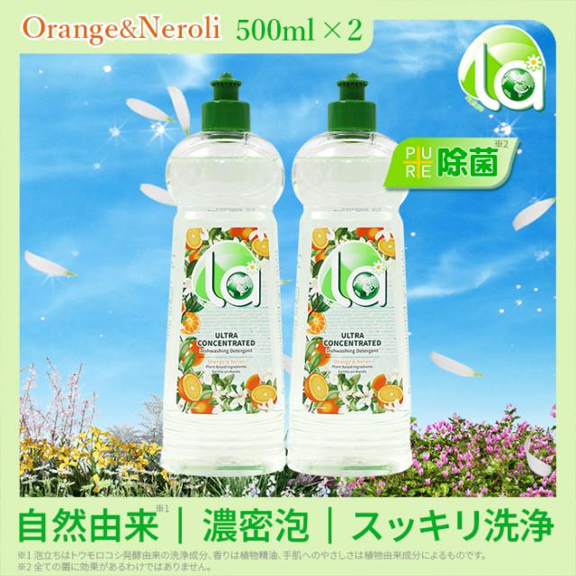 【新発売】la 食器用洗剤 家庭用洗剤 500mlx2 セット 本体 植物由来 天然由来成分 濃縮タイプ 処方 強力油汚れ 泡切れすっきり 手肌にやさしい 無残留処方 爽やかオレンジ&ネロリ