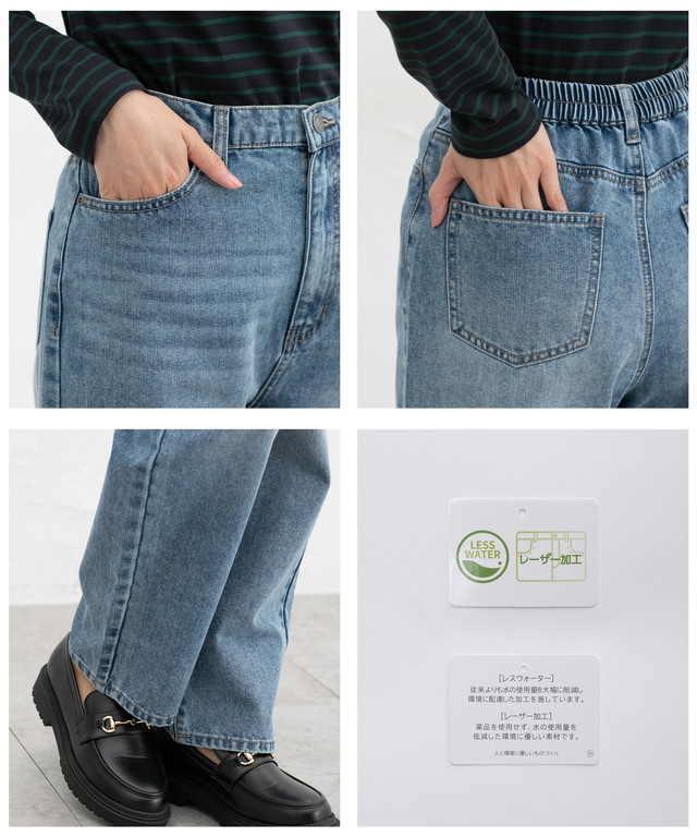 水の使用量を削減し、レーザーによるダメージ加工で薬品を使用せず、環境に配慮して作られた、柔らかめで洗濯後も乾きやすい綿混デニム素材。