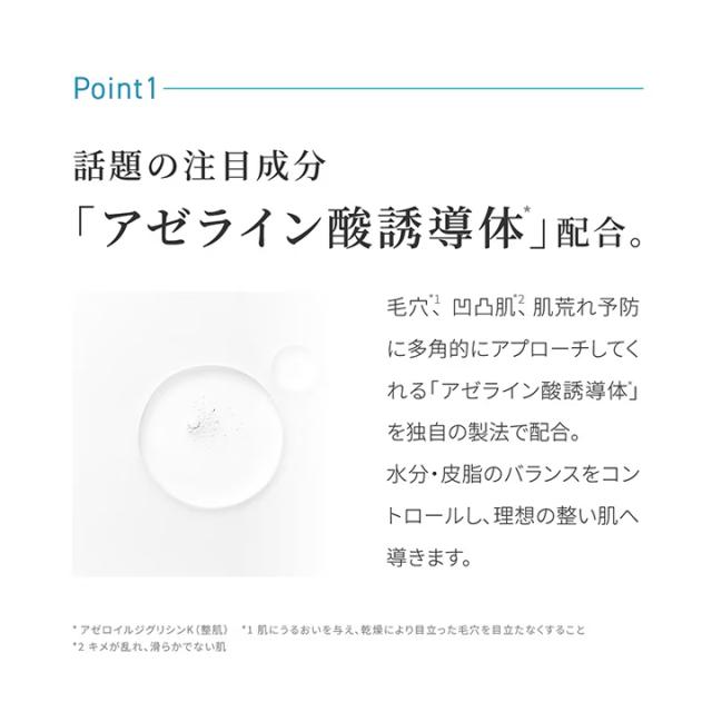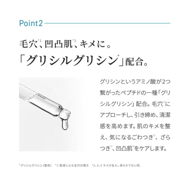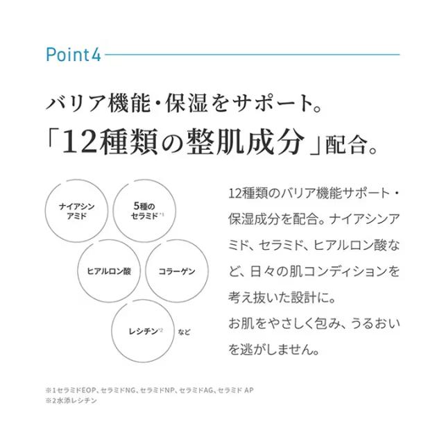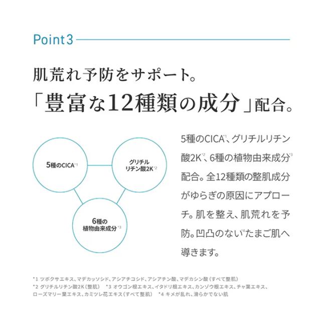 | 全成分 | 水、BG、アゼロイルジグリシンK、グリシルグリシン、ナイアシンアミド、グリセリン、PEG/PPG/ポリブチレングリコール−8/5/3グリセリン、ツボクサエキス、オウゴン根エキス、イタドリ根エキス、カンゾウ根エキス、チャ葉エキス、ローズマリー葉エキス、カミツレ花エキス、マデカッソシド、アシアチコシド、アシアチン酸、マデカシン酸、水添レシチン、加水分解コラーゲン、ヒアルロン酸Na、グリチルリチン酸2K、フィトステロールズ、セラミドEOP、セラミドNG、セラミドNP、セラミドAG、セラミドAP、ペンチレングリコール、キサンタンガム、アルギニン、クロスポリマー(アクリレーツ/アクリル酸アルキル(C10−30))、フェノキシエタノール、メチルパラベン |