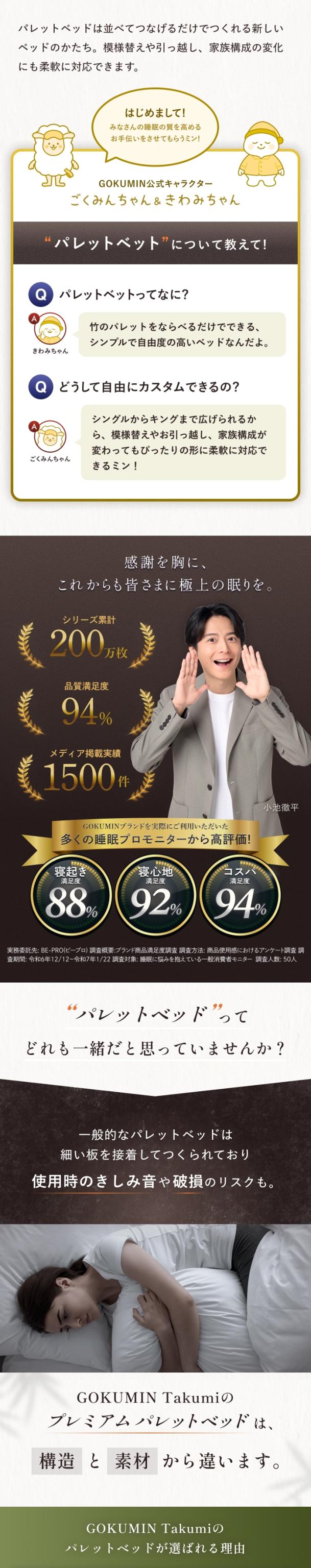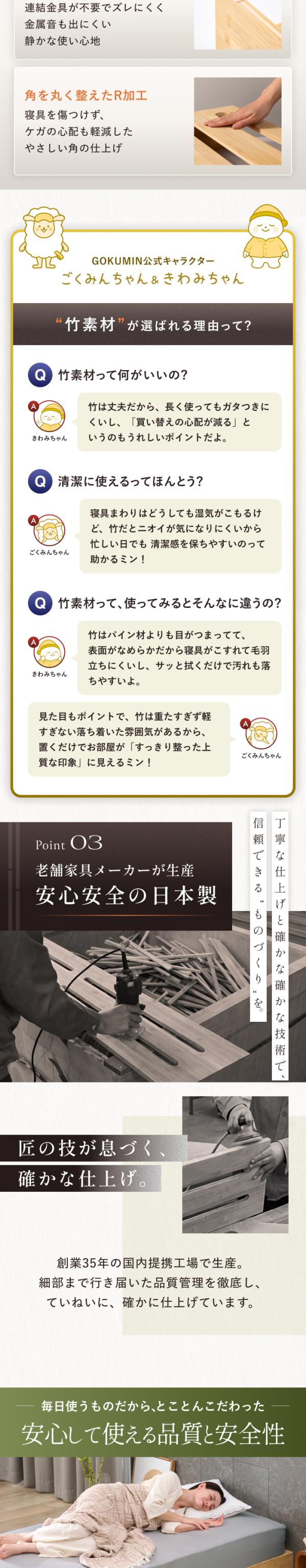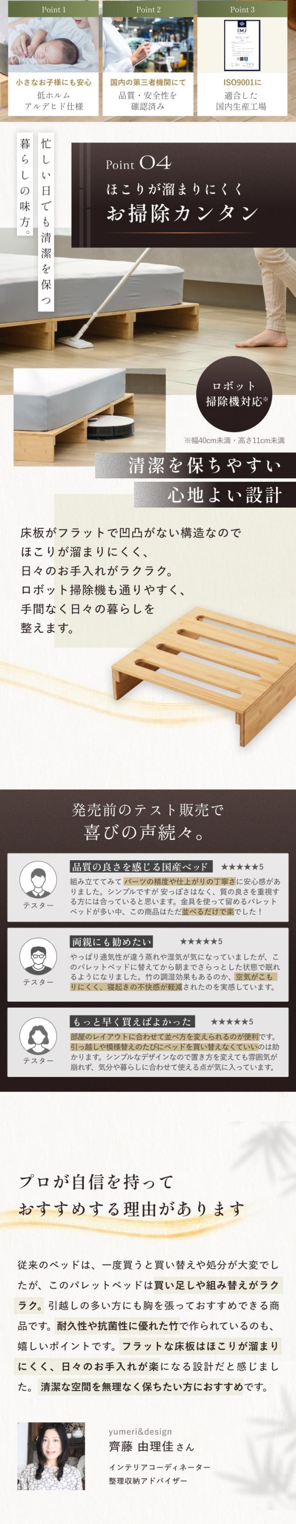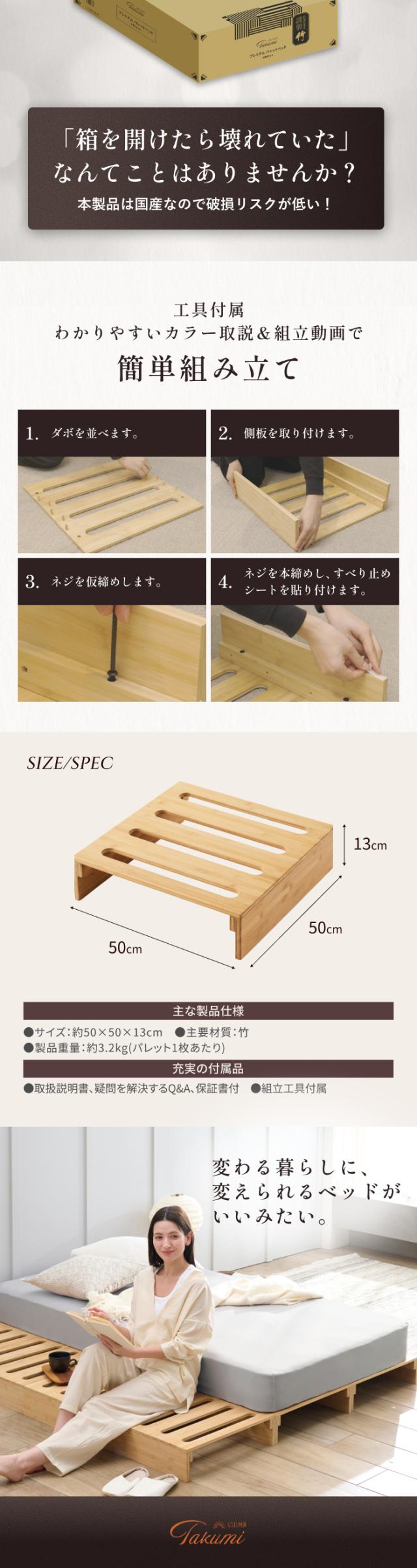 本製品は「一生モノのパレットベッドをお届けしたい」という想いから生まれました。竹素材がもたらす強靭さと清潔さに加え、日本のものづくり技術を掛け合わせ、耐久性・清潔性・使いやすさを徹底的に追求いたしました。ライフスタイルが変わっても、永く暮らしに寄り添い続けます。