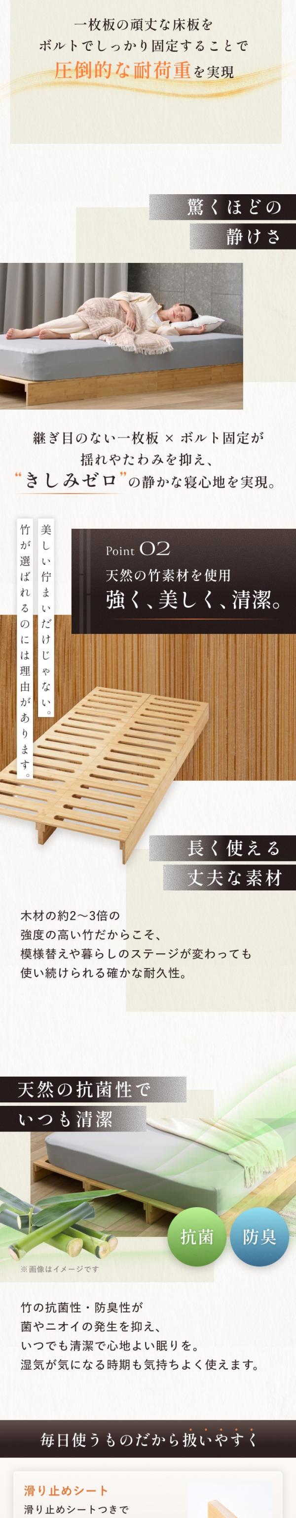 竹が本来持つ天然の抗菌性・防臭性により、菌やニオイの発生を抑え、いつでも清潔な状態を保ちます。湿気がこもりやすい寝具環境でも、すのこ構造が空気を通しやすく、ムレにくいのが特徴です。汗をかきやすい季節や梅雨時期でも快適に使え、心地よい眠りをサポートします。毎日使うものだからこそ、衛生面にも配慮した設計です。