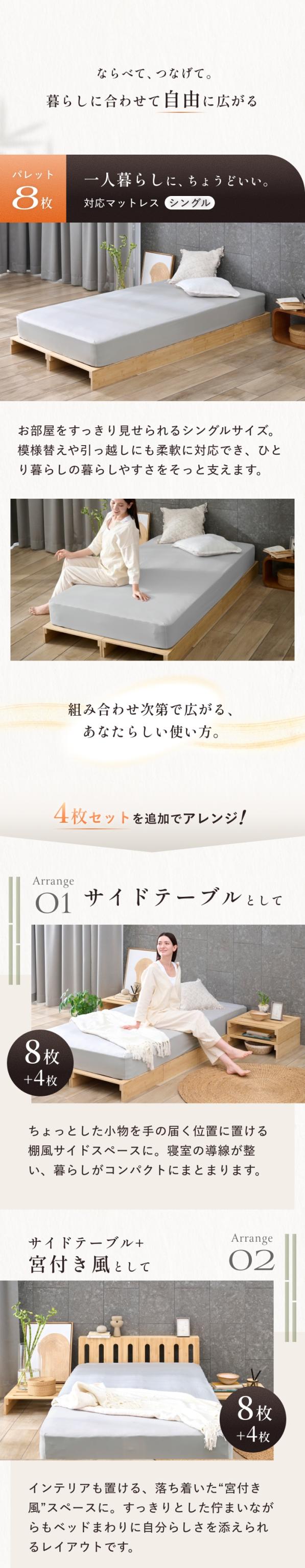 ●サイズ : 約50×50×13cm(パレット1枚あたり) /パレット 8枚使用時:シングルサイズ対応 /パレット12枚使用時:ダブルサイズ対応