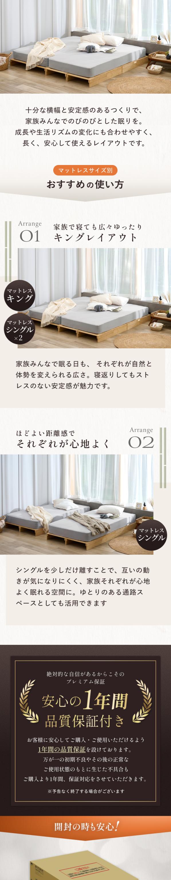 必要な枚数を並べるパレット方式のため、シングルからクイーン、キングサイズまで自由にサイズを調整可能です。引っ越しや家族構成の変化があっても、買い替えることなくレイアウトを変更できます。高さを抑えたロースタイルは視界を遮らず、限られたスペースでもお部屋に開放感をもたらします。
