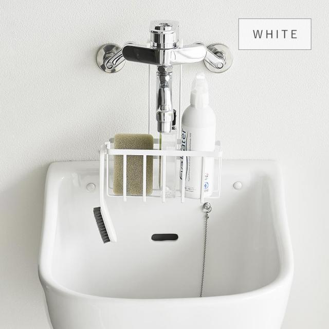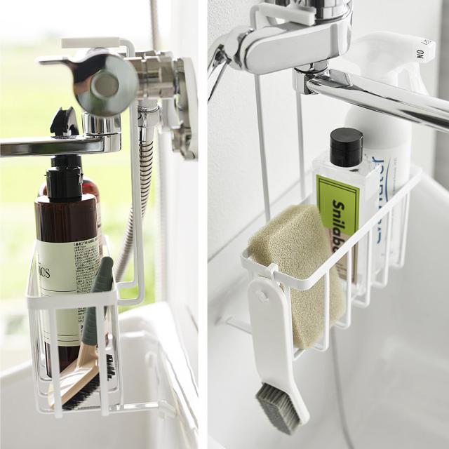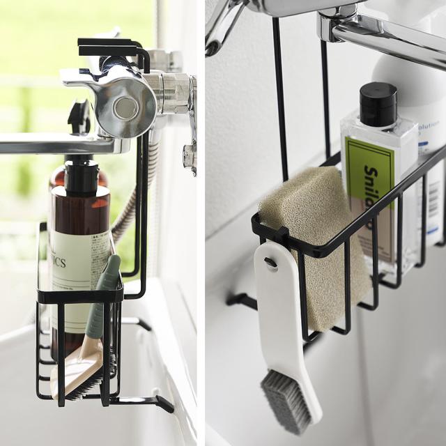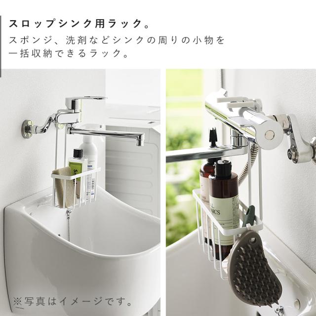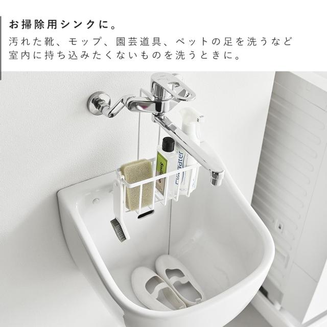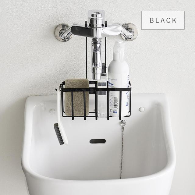 スロップシンクの蛇口にひっかけるだけ!置き場所に困るシンク周りの小物を収納できるラックです。