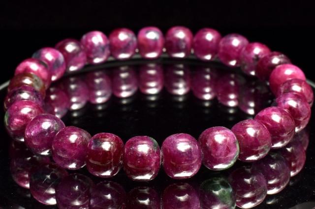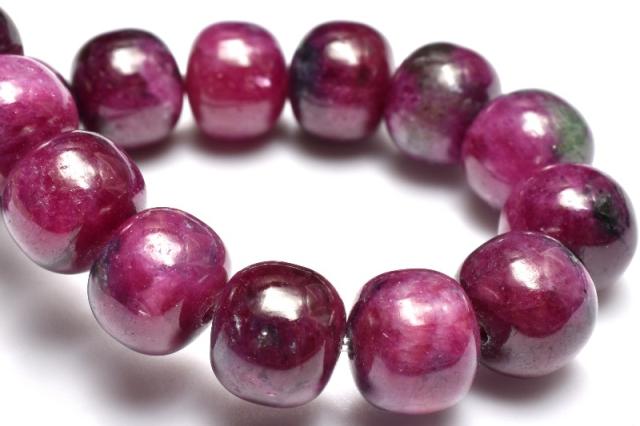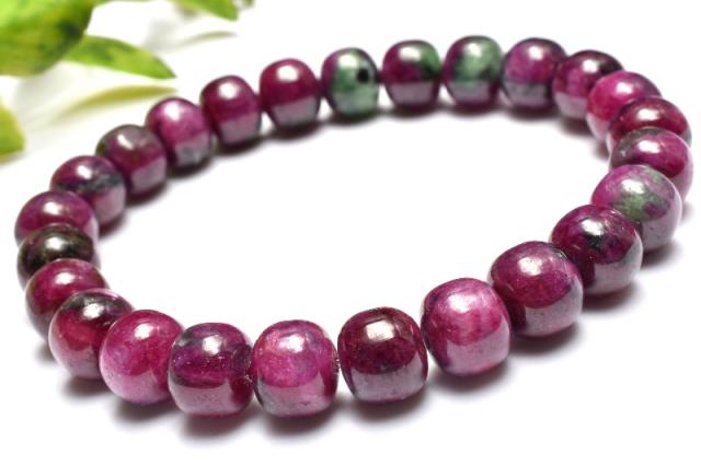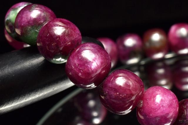| 特徴・意味 | 濃厚なワインレッドカラーが美しいルビーが多めのルビーインゾイサイトが入荷しました。 シラーや、結晶構造が見られる珠もあり原石好きのコレクター様にもオススメのブレスレットです。 近年どんどん流通量が減っており、入荷数も少ない商品になります。 勝ちたい勝負や成就したい恋愛がある方は勝利の石とも呼ばれるルビーをぜひご検討くださいませ。 ルビーインゾイサイトは、和名を灰簾石といいます。 緑色の部分をゾイサイト、赤〜桃色の部分がルビーでそれらが混ざりあった天然石です。 緑色の部分であるゾイサイトは、別名「アニョライト」と言い、マサイ族の言葉で「緑」の意味を持つ「anyoli」が語源とされています。 (ゾイサイトの青色がタンザナイトと呼ばれています) |