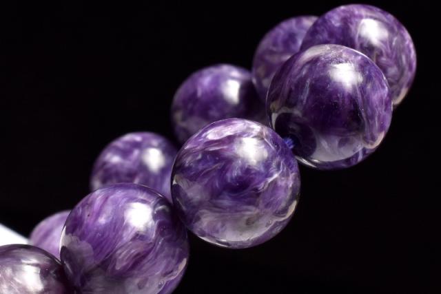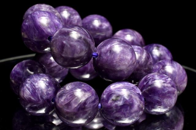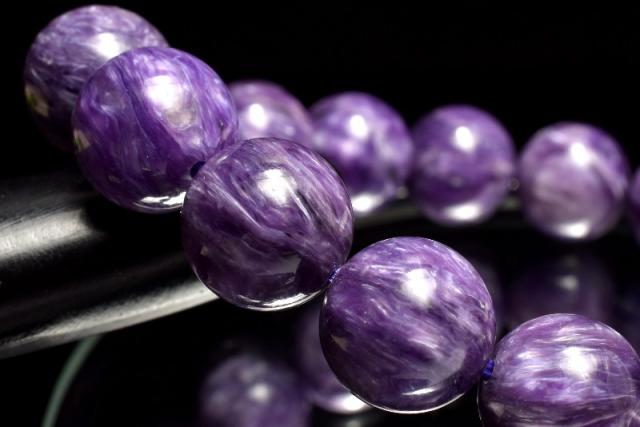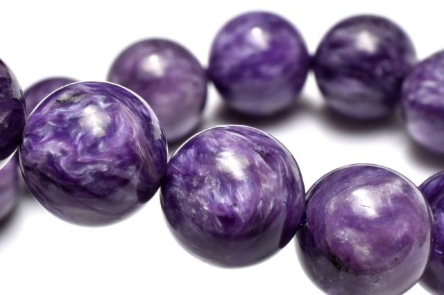 | 特徴・意味 | 非常に高発色で美しい高品質チャロアイトを入荷いたしました! シルキーで幻想的な紫の濃淡を存分に堪能できます。 流れるようなマーブル模様はまるで油絵のようで力強く、一粒一粒違う模様にうっとりします。 流通量が減少傾向にあり黒点が少ないものや、マーブル模様が美しいものは数量限定で入荷となっております。 是非お手元でご堪能いただきたいイチオシ品です。 「チャロアイト」は、「スギライト」や「ラリマー」と同じく、世界三大ヒーリングストーンの一つに数えられる石です。油彩画のような質感を持つ芸術的な印象を持つ石で、この不思議な模様は、黒色:エジリン(Aegirine錐輝石)、帯状の灰色:マイクロクリン(Microcline微斜長石)、白色:カリ長石(PotassiumFeldspar)、黄緑色:カナサイト(Canasite)、淡黄色:ティクナクサイト(Tinaksite)などの鉱物が、マーブル状に混ざりあうことから成り立っています。薄紫色の彩色は不純物のマンガンに起因します。 チャロアイトという名前の由来には、シベリアのチャロ川流域で発見された事とする説と、ロシア語の(Charo魅惑)から名づけられたという説がありますが、後者の方が有力であるとされています。その名の通り、この石の個性的な模様は、見る人を魅了してやみません。まさに、「魅惑の宝石」にぴったりな石です。 |