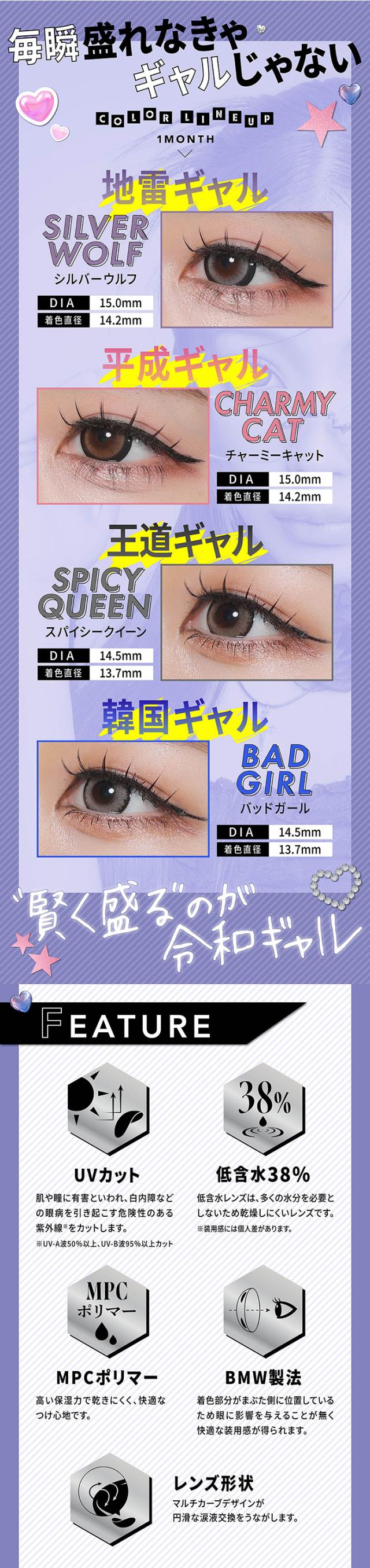 | 着色直径 | 13.7mm:スパイシークイーン/バッドガール 14.2mm:シルバーウルフ/チャーミーキャット |