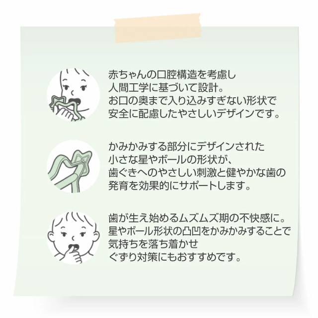 ・歯が生え始めた赤ちゃんが噛み続けると、ちぎれる可能性があります。