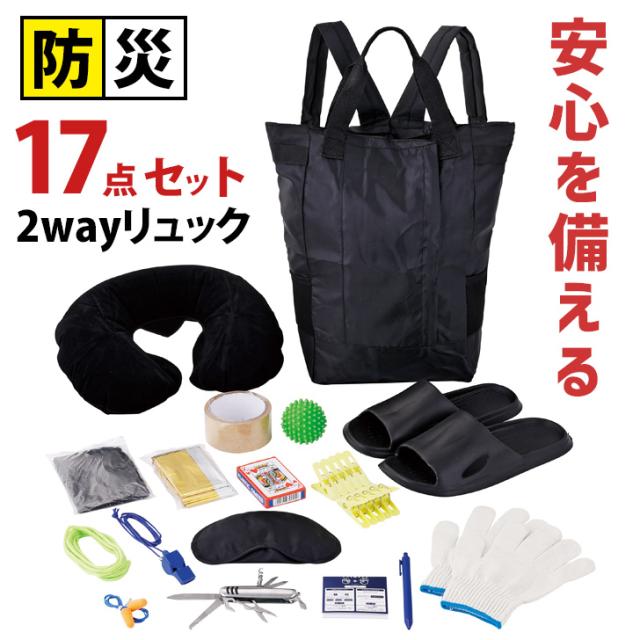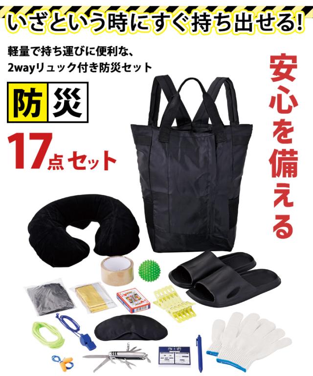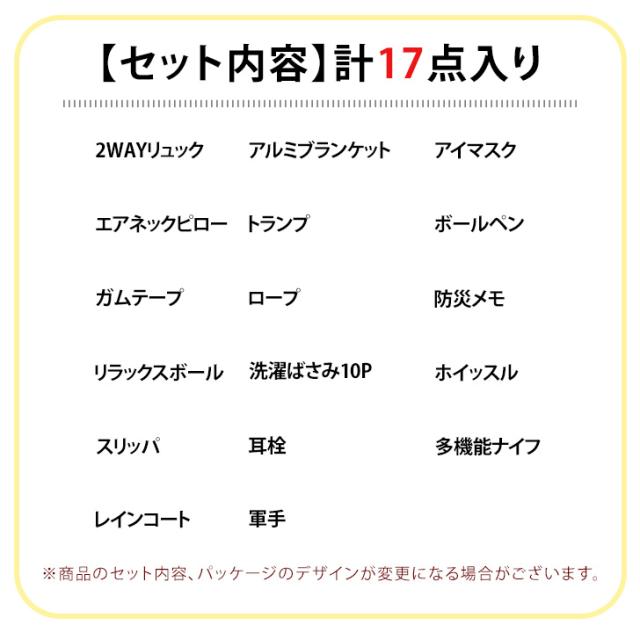 2WAYリュック、エアネックピロー、ガムテープ、リラックスボール、スリッパ、レインコート、アルミブランケット、トランプ、ロープ、洗濯ばさみ10P、軍手、アイマスク、ボールペン、防災メモ、耳栓、ホイッスル、多機能ナイフ