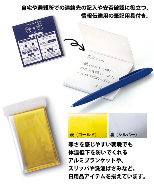 自宅や避難所での連絡先の記入や安否確認に役立つ、情報伝達用の筆記用具付き。